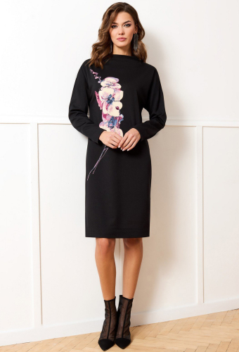 Платье прямого силуэта. Рукав втачной одношовный. По переду платья - нагрудная вытачка, выходящая из бокового шва. По горловине спинки - вырез "капелька" на одну пуговицу и навесную петлю. Длина по середине спинки -106 см, длина рукава-61 см. Фурнитура может быть изменена, сохраняя целостность художественного замысла.