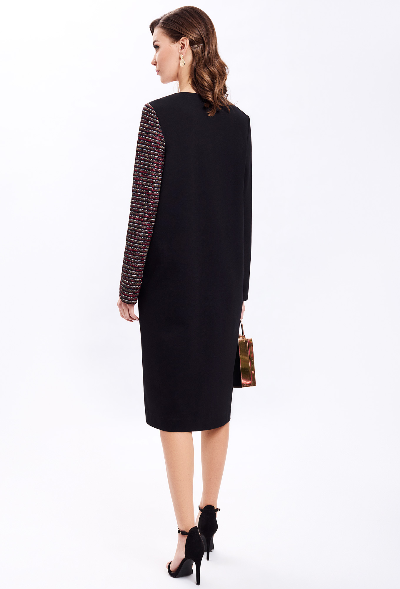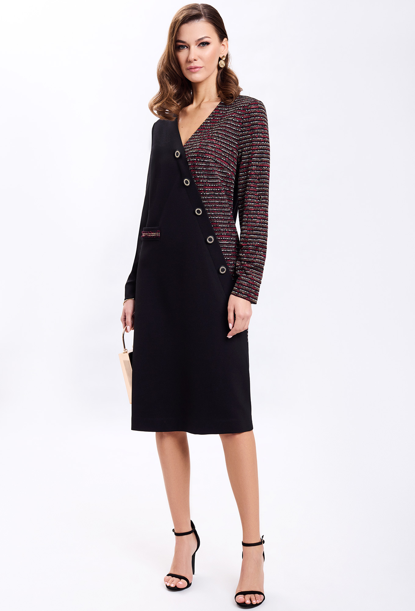 Платье прямого силуэта с V-образным вырезом горловины и нагрудными вытачками из бокового шва. Перед с подрезом по диагонали, в котором обработана имитация застежки на 6 пуговиц. На правой части переда декоративная листочка. Спинка со средним швом. Рукав втачной одношовный. Длина рукава регулируется патой. Левая часть переда, левый рукав, листочка и паты выполнены из отделочной ткани. Фурнитура может быть изменена, сохраняя целостность художественного замысла.