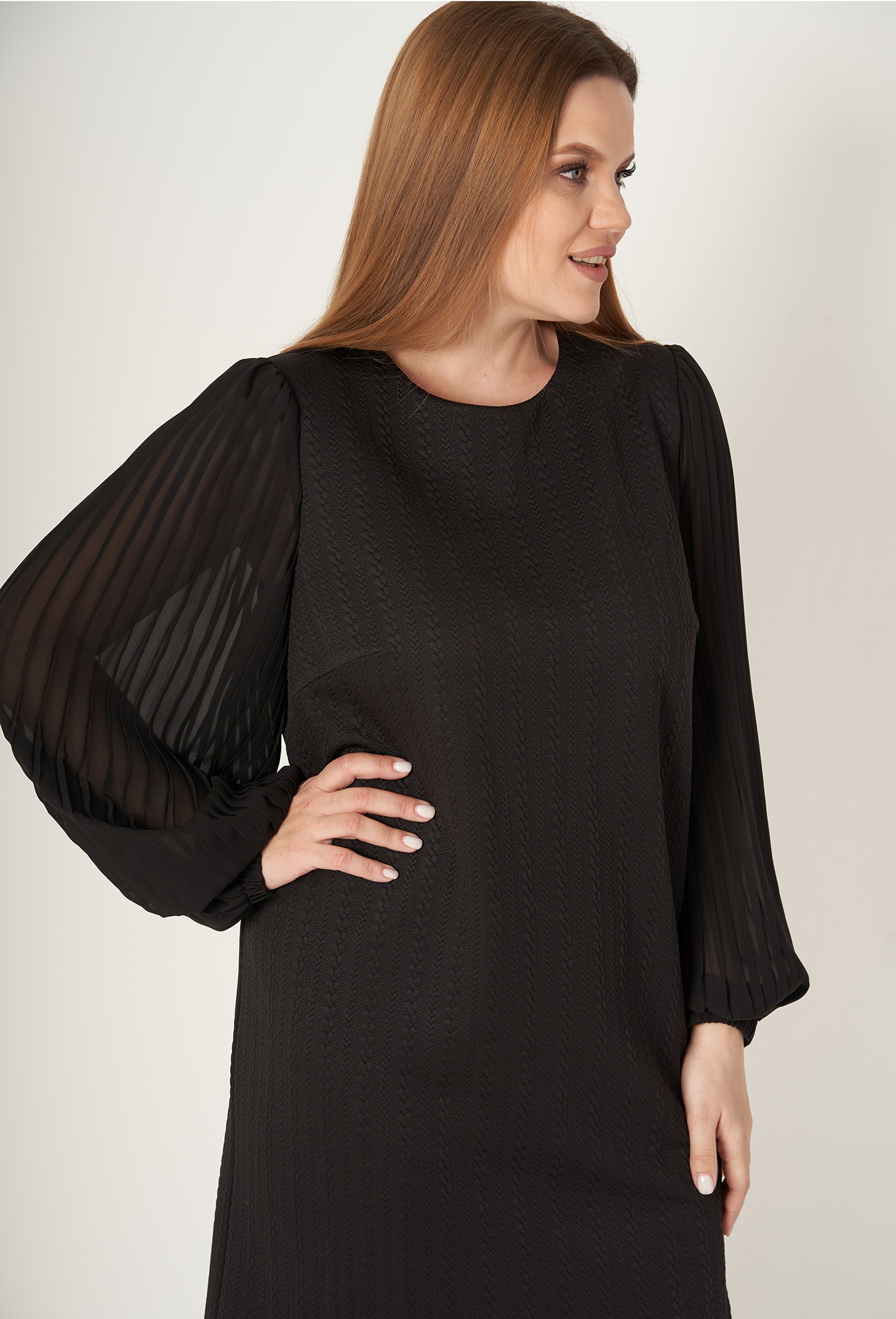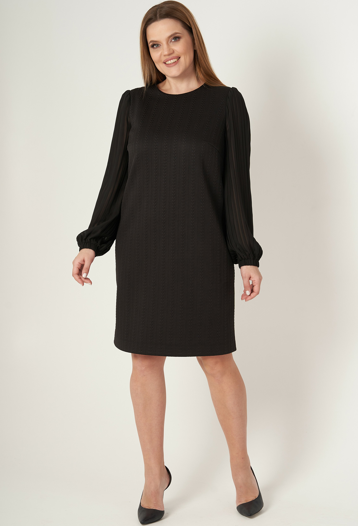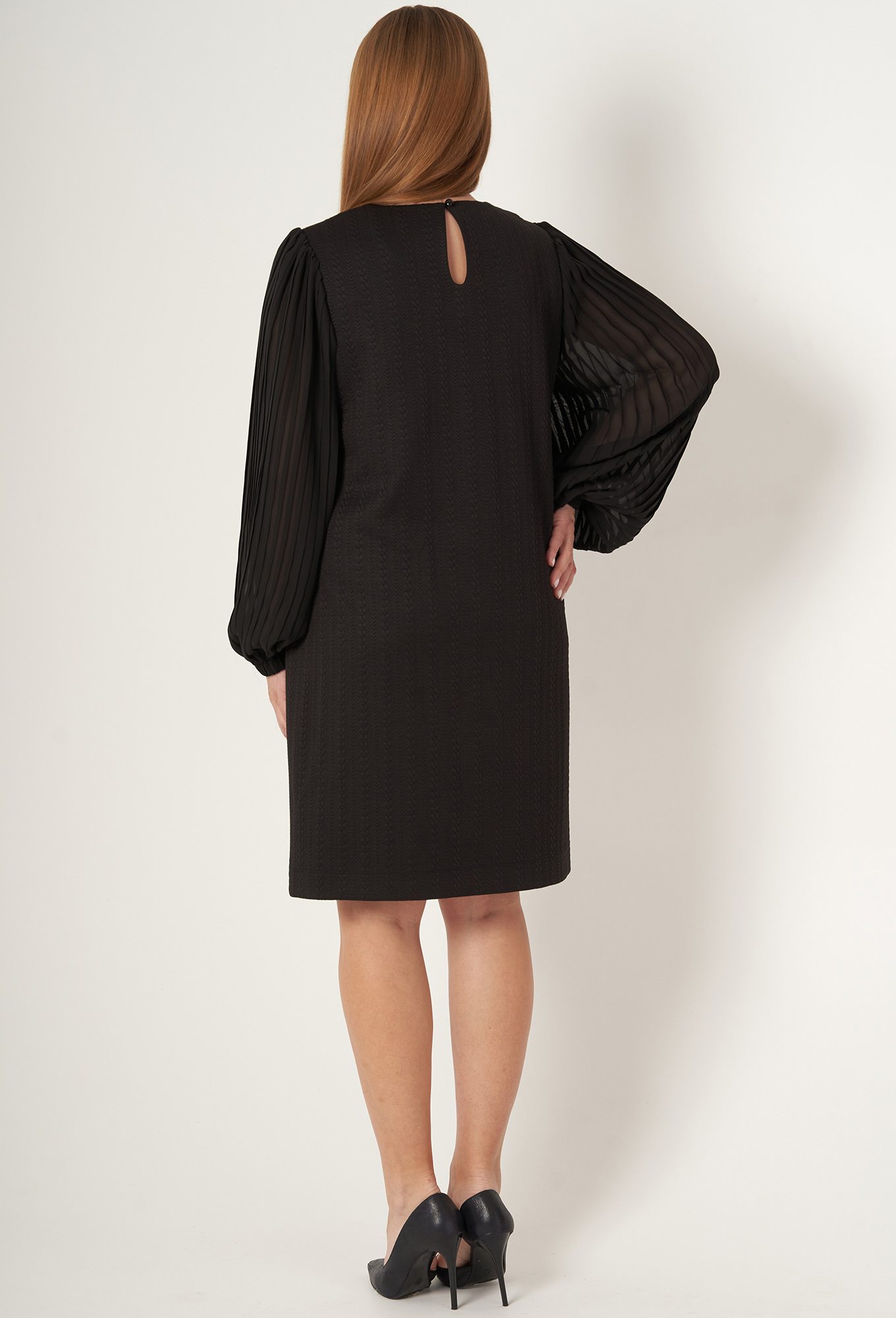 Платье А-силуэта с нагрудными вытачками из бокового шва. По горловине спинки обработан вырез-"капелька" с застежкой на пуговицу. Рукав одношовный втачной со сборкой по окату. Низ рукава с отрезной манжетой на резинке. Рукав выполнен из отделочной плиссированной ткани.