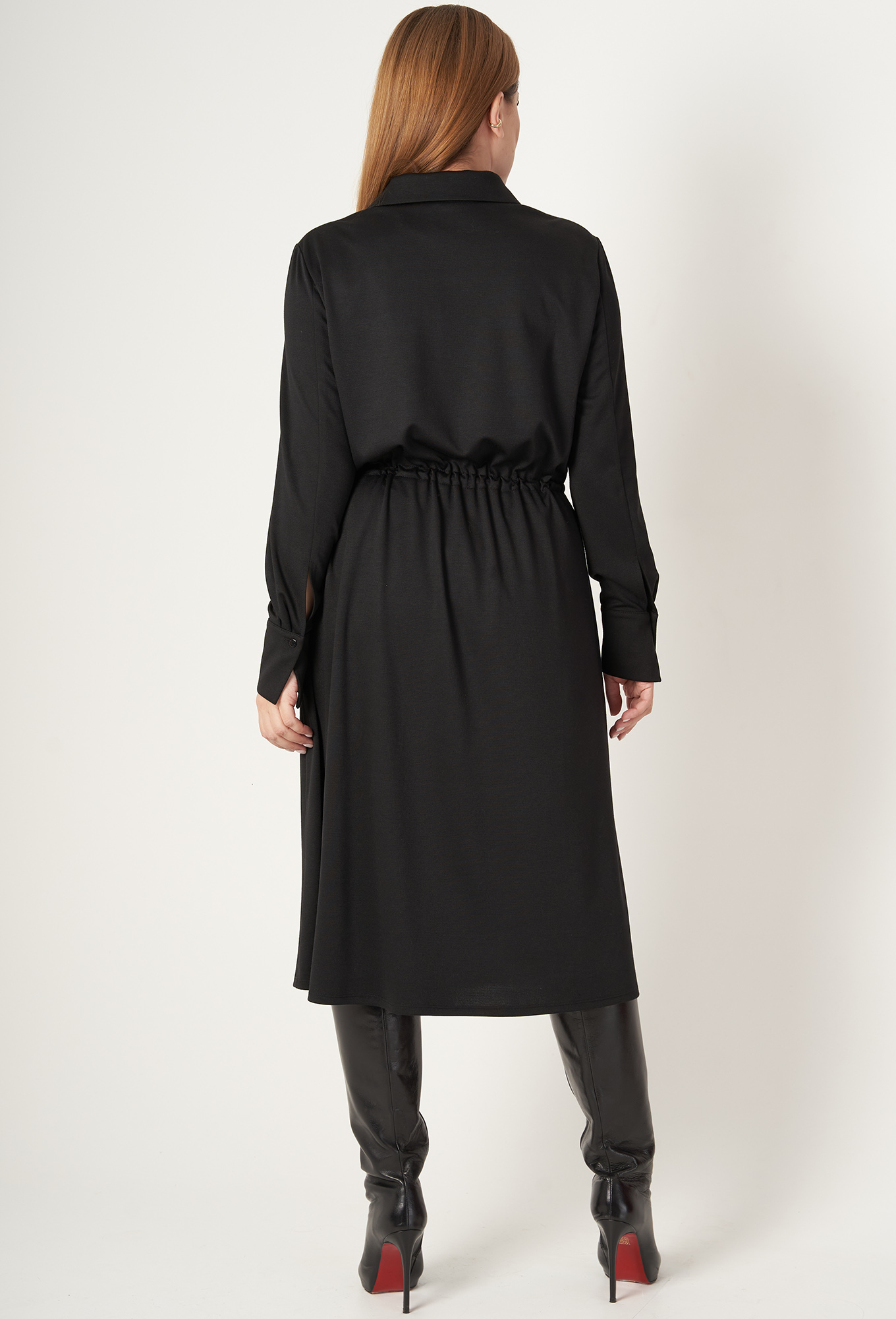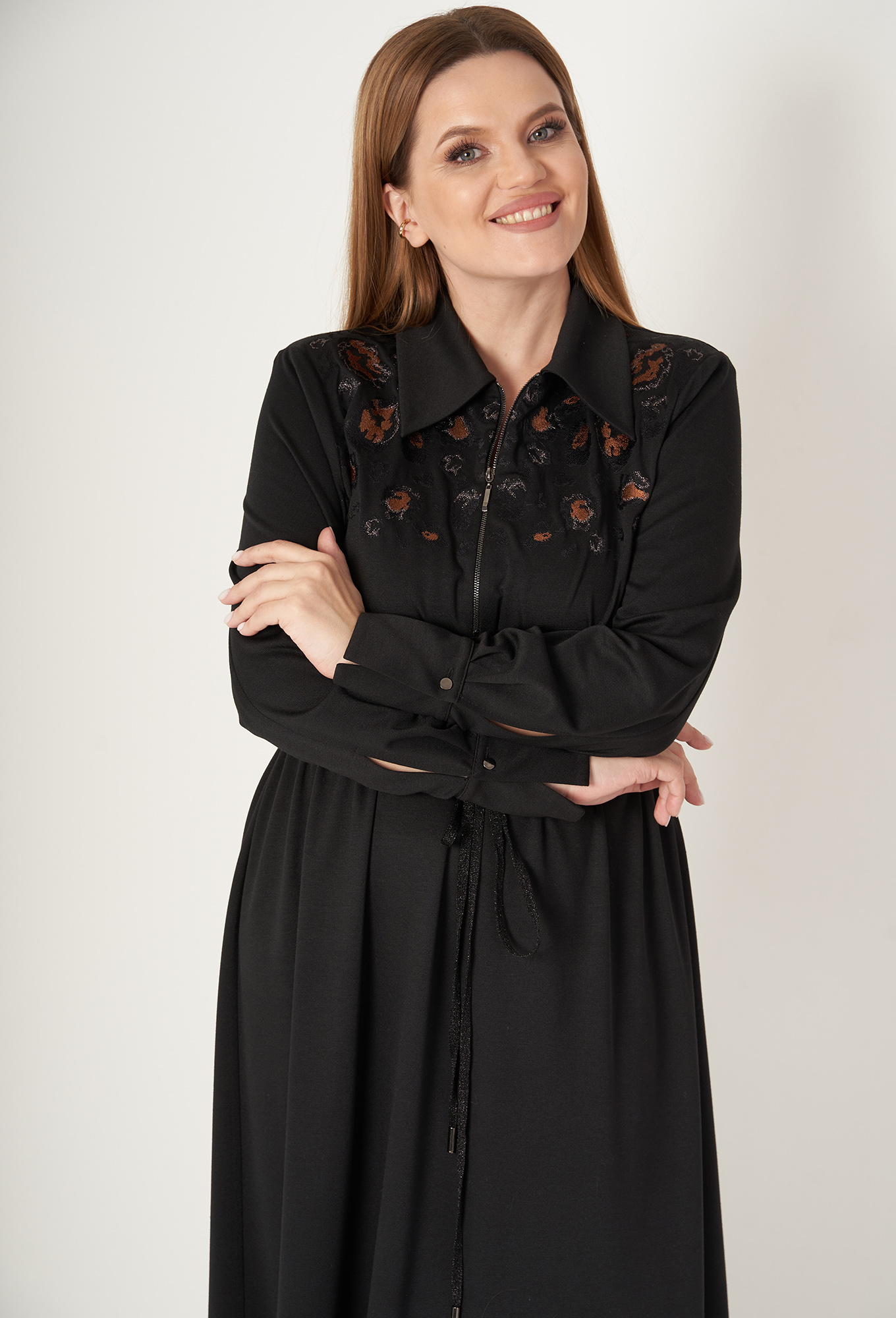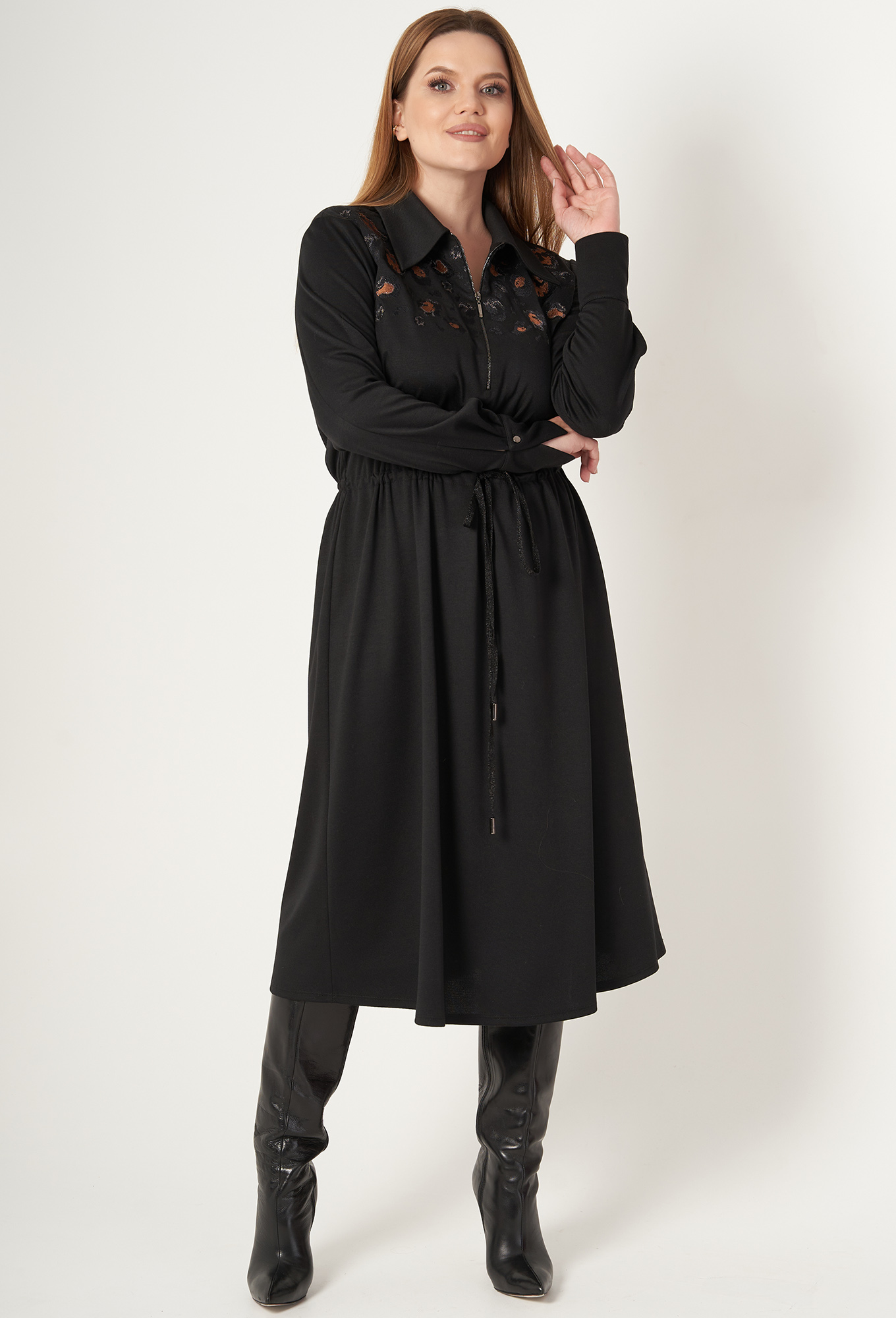 Платье А-силуэта приталенное при помощи кулисы со шнуром. Воротник отложной. По переду в верхней части застежка молния. Рукав одношовный втачной. Низ рукава с отрезной манжетой с застежкой на одну петлю и пуговицу. В верхней части переда выполнена вышивка.