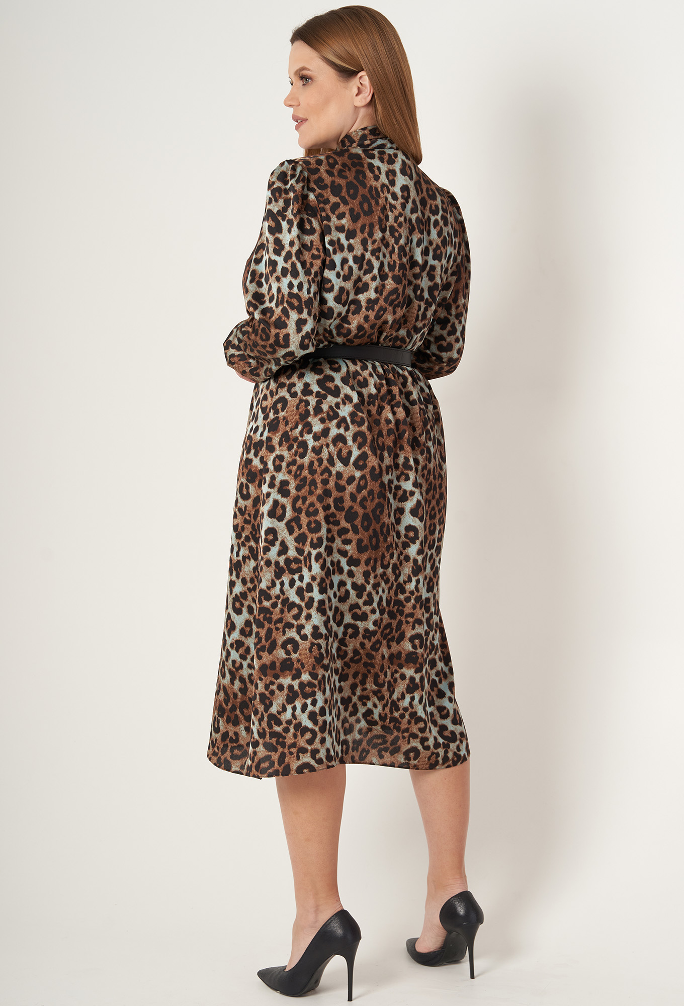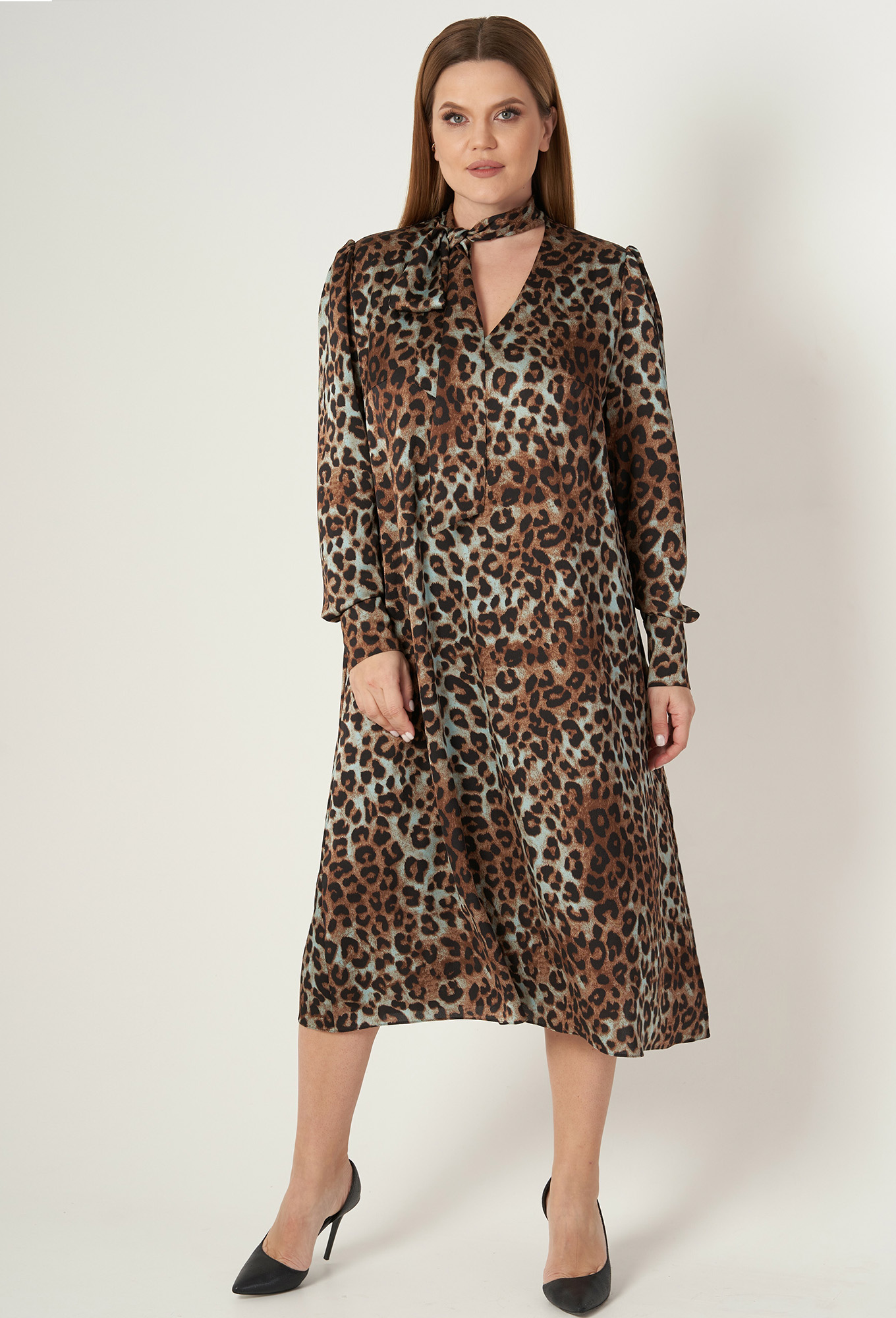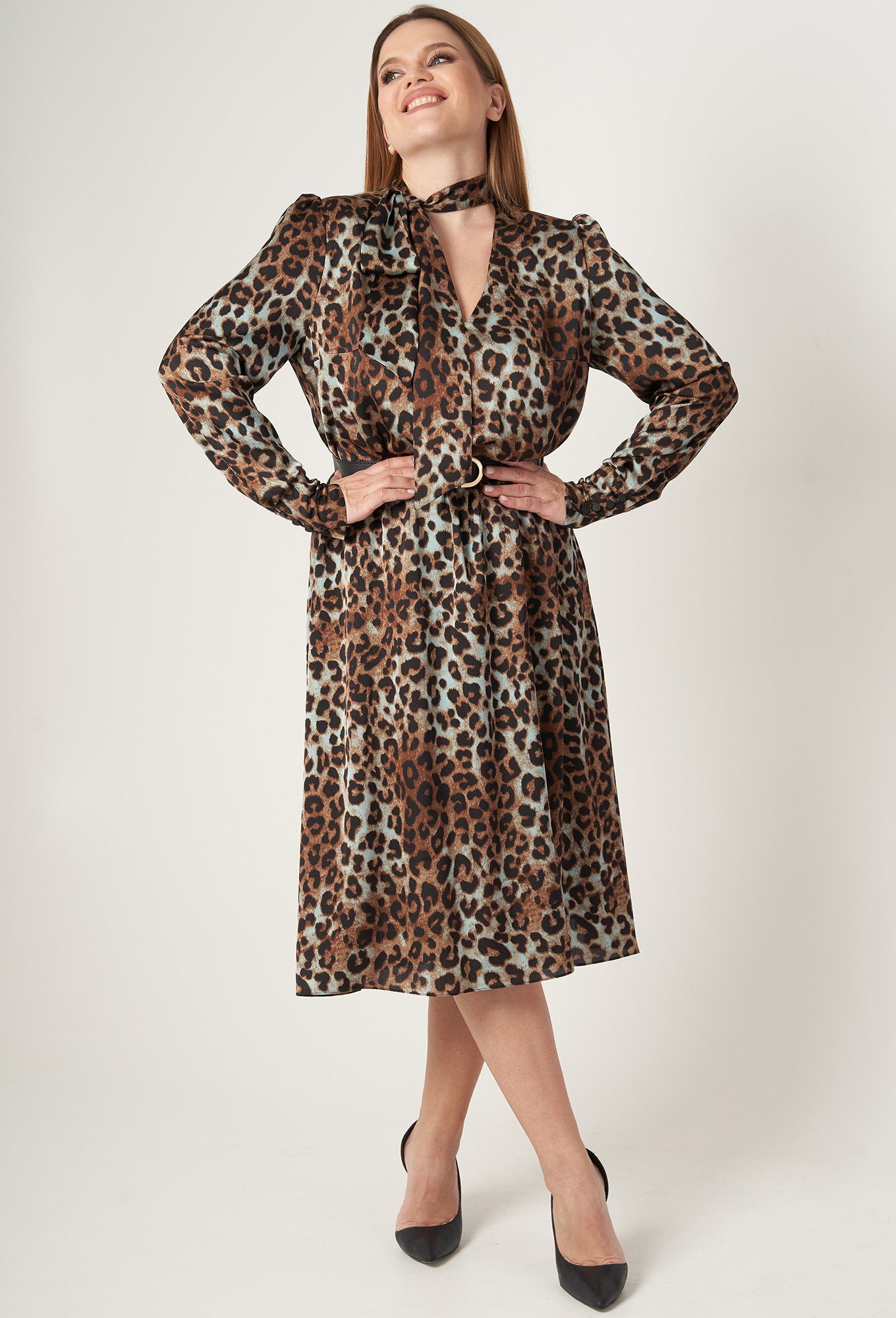 Платье А- образного силуэта. Перед с двумя нагрудными вытачками. Горловина V-образной формы с мягким воротником стойкой переходящим в бант со скошенными коцами спереди. Рукав одношовный втачной со сборкой по окату. По низу рукава высокая манжета с застежкой на 4 петли и пуговицы. Платье на подкладке. К платью прилагается ремень из кожзама с матовой золотой пряжкой. Фурнитура может быть изменена, сохраняя целостность художественного замысла.