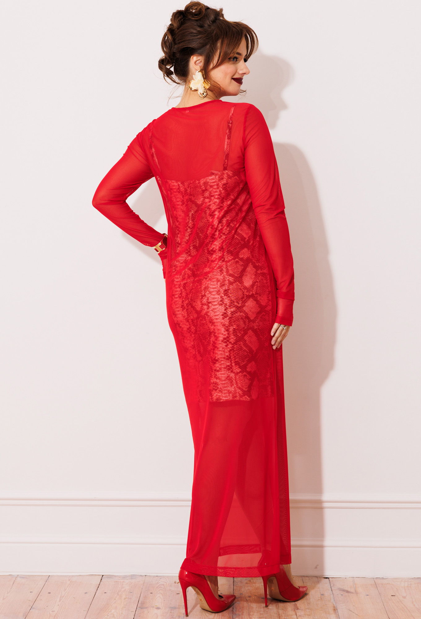 Платье состоит из двух частей. Нижнее платье полуприталенного силуэта из трикотажной ткани с принтом питон. Платье на регулируемых бретельках. Перед с нагрудными и талиевыми вытачками. Спинка со средним швом и талиевыми вытачками. Верхнее платье прямого силуэта выполнено из сетки. В боковом шве разрез. Рукав втачной одношовный удлиненный с вырезом на палец на руке.
