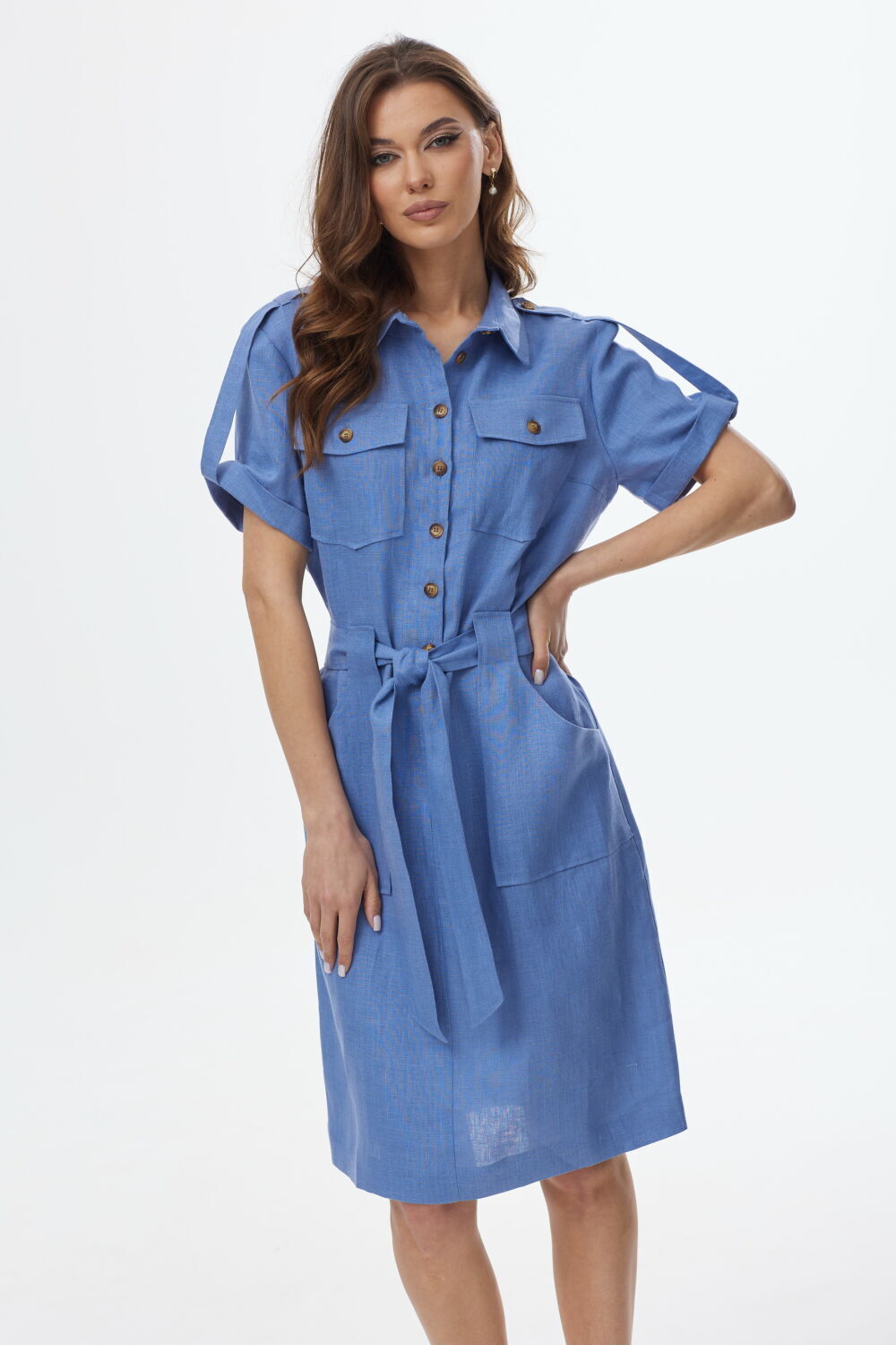 Платье с центральной застежкой на петли и пуговицы, втачным воротником с отрезной стойкой. По переду- накладные карманы с клапанами расположенные на уровне груди. Накладные карманы с цельнокроенной патой расположены на уровне бедер. Спинка со средним швом. Пата рукава переходящая в погон по плечевым швам. Платье со съемным поясом.