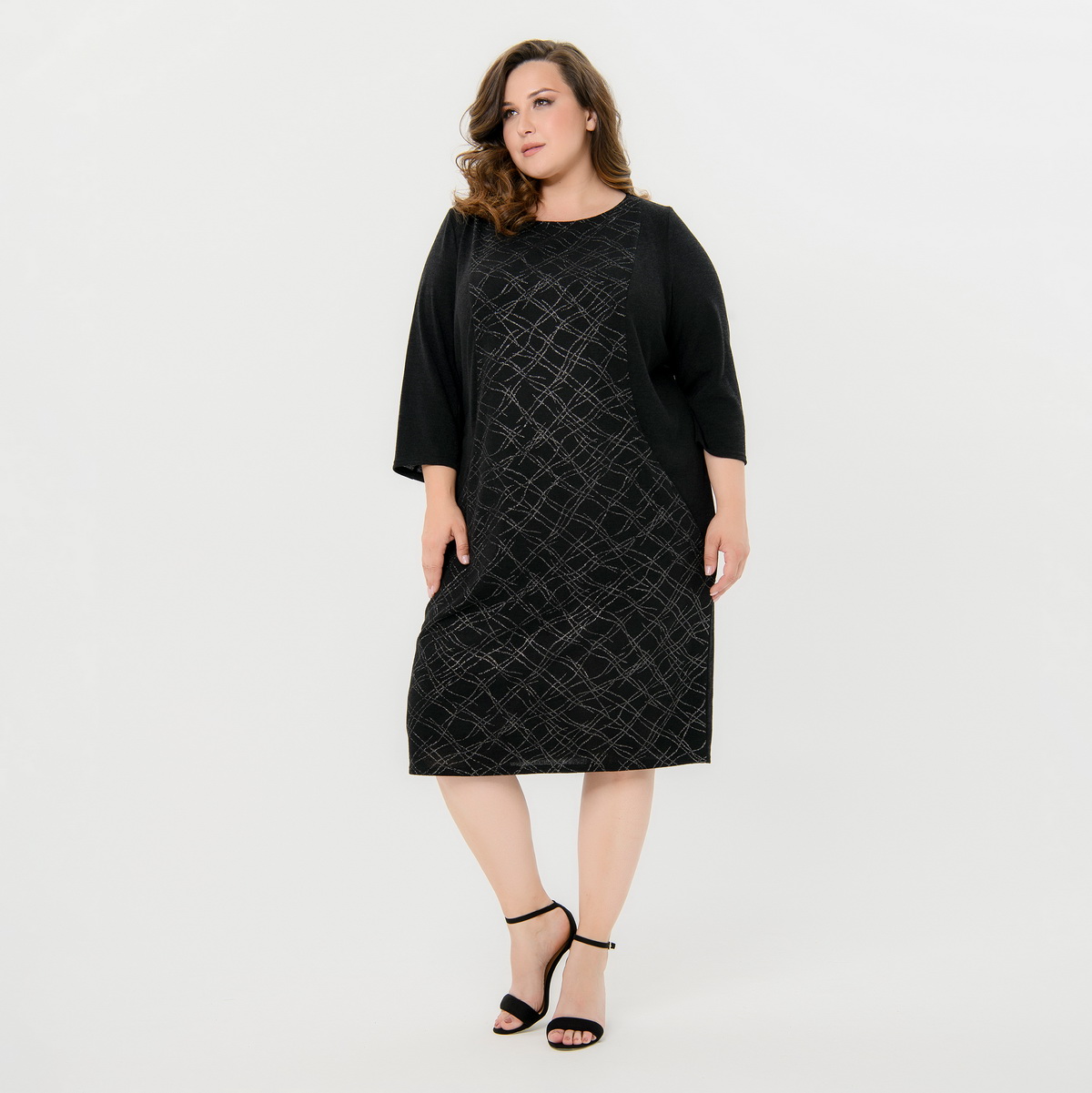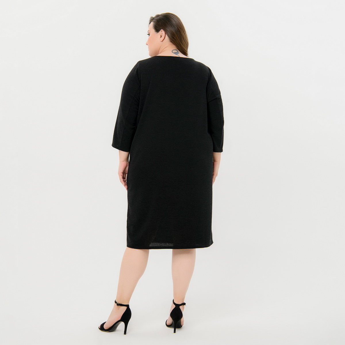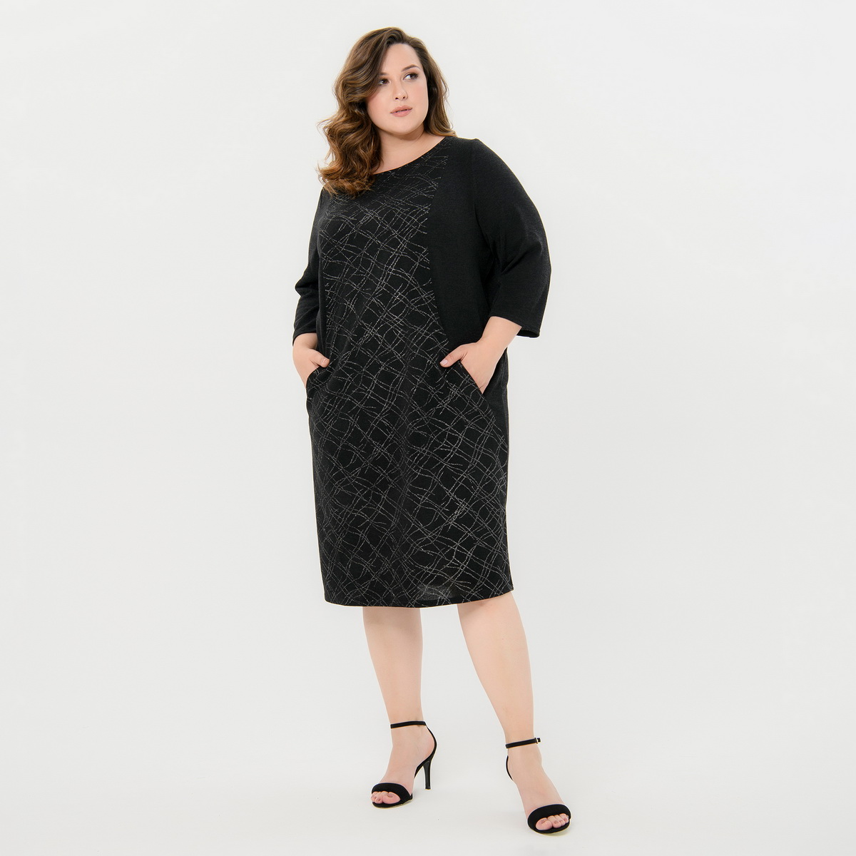 Платье прямого силуэта из искусственной ангоры. Центральная часть переда платья с мерцающим напылением, отрезные бочки, спинка и рукава из ткани-компаньона. В рельефных швах обработаны карманы. Рукав двухшовный, длиной 3/4.