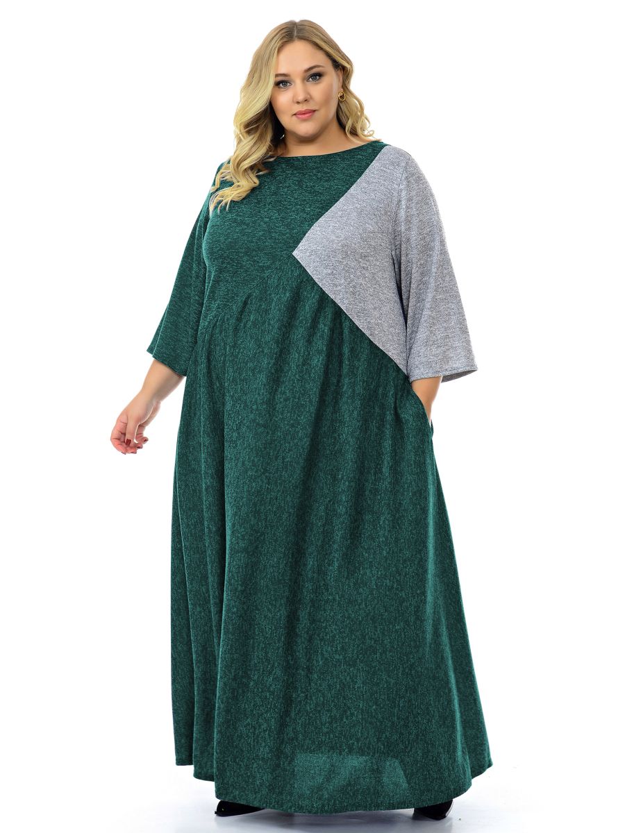 Платье длинное, свободного силуэта, из меланжевой ткани на основе вискозы. Нижняя часть платья отрезная, присборенная. Линия подреза по переду фигурная, по спинке горизонтальная. Основной цвет зеленый. Левая часть переда и левый рукав из отделочной светло-серого оттенка такого же качества как основной материал.  В боковых швах карманы. Рукав втачной, свободный.