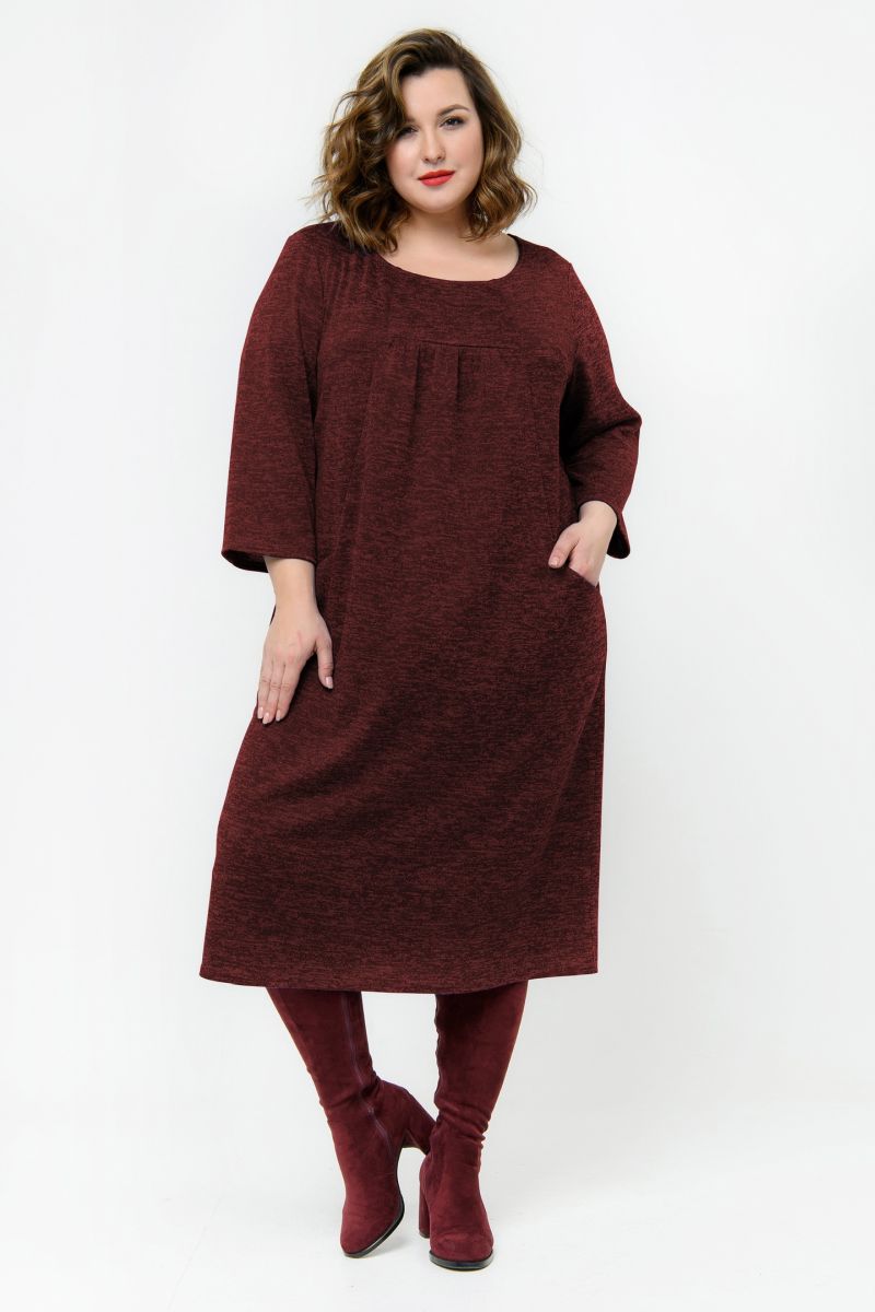 Платье из джерси-меланжа прямого силуэта. Вырез горловины округлый. По переду фигурные рельефные швы, в которых обработаны карманы.