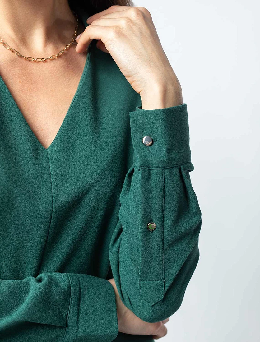 Платье приталенного силуэта и воротником-поло. Выполнено из эластичного крепа. Универсальная модель и трендовый крой в стиле 70-х годов, выгодная инвестиция для повседневного образа, деловой встречи или вечернего выхода. Можно носить с поясом, чтобы дополнительно подчеркнуть талию и А-силуэт. зеленый