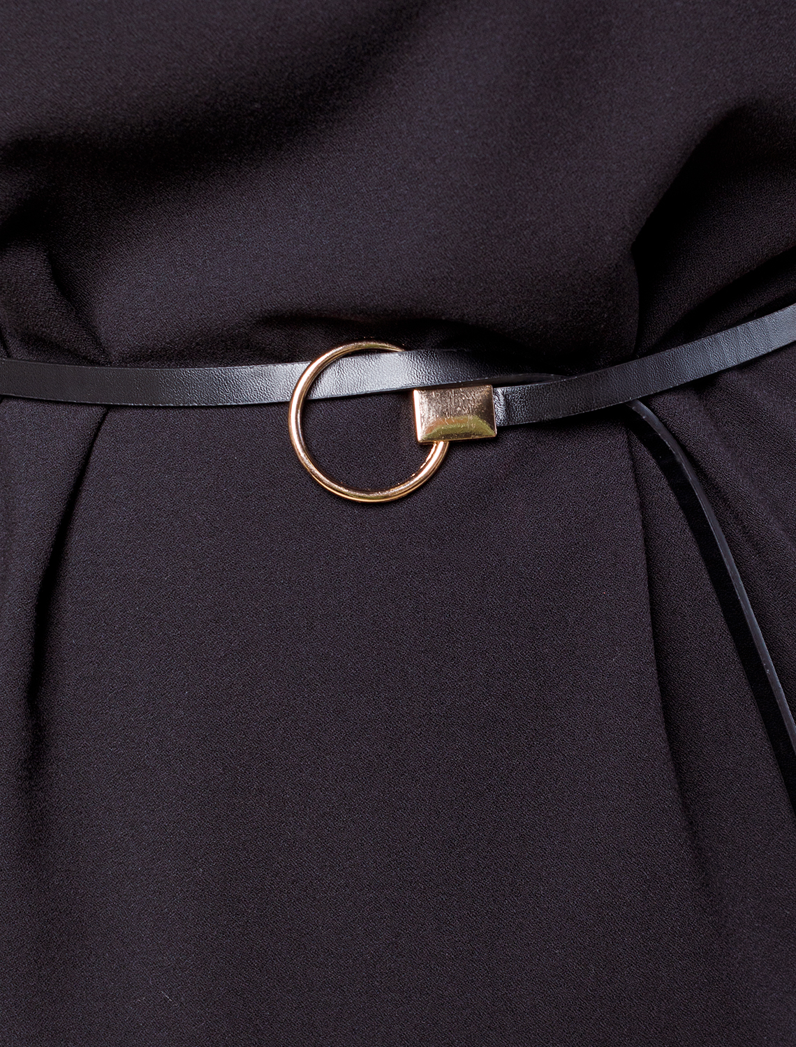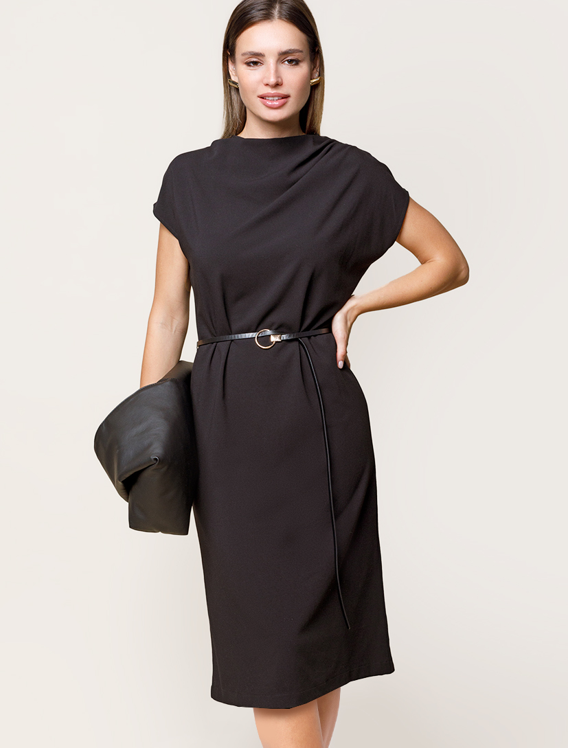 Лаконичное платье сшито из эластичного крепа. Достаточно сдержанный вырез горловины хорошо комбинирует с цельнокроеным рукавом и мягкой драпировкой на плече. На спинке застежка из двух пуговиц. Ткань почти не мнется и хорошо держит форму. В подарок идет ремешок из эко-кожи. черный