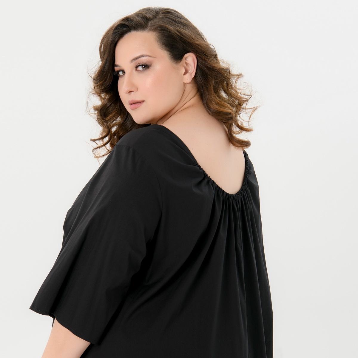 Платье свободного силуэта. Боковые швы смещены на переднюю половинку платья, в них обработаны карманы.  Рукав втачной, свободный. Основным декоративным элементом является вырез горловины на спинке, в который вставлена резинка, образующая сборочку.