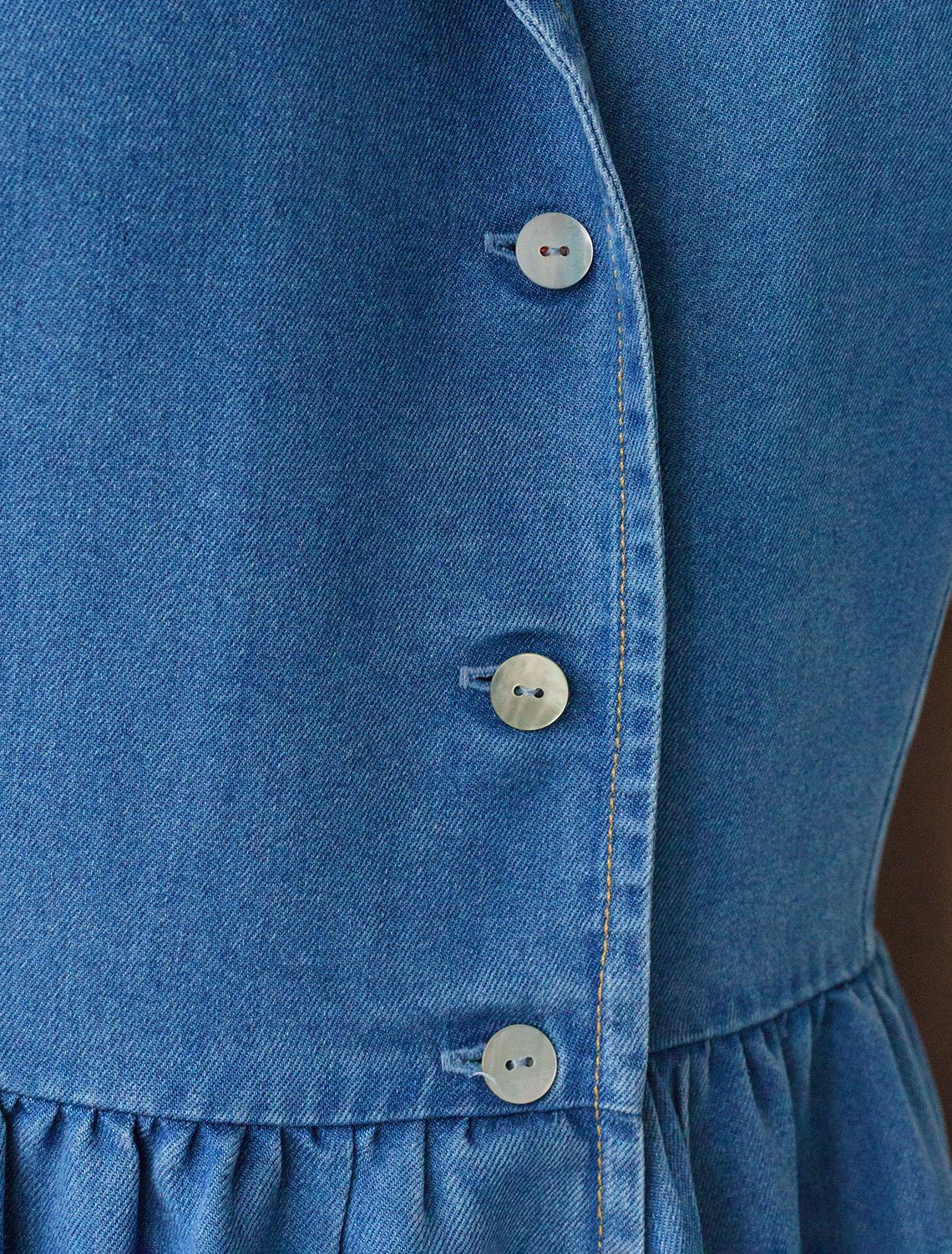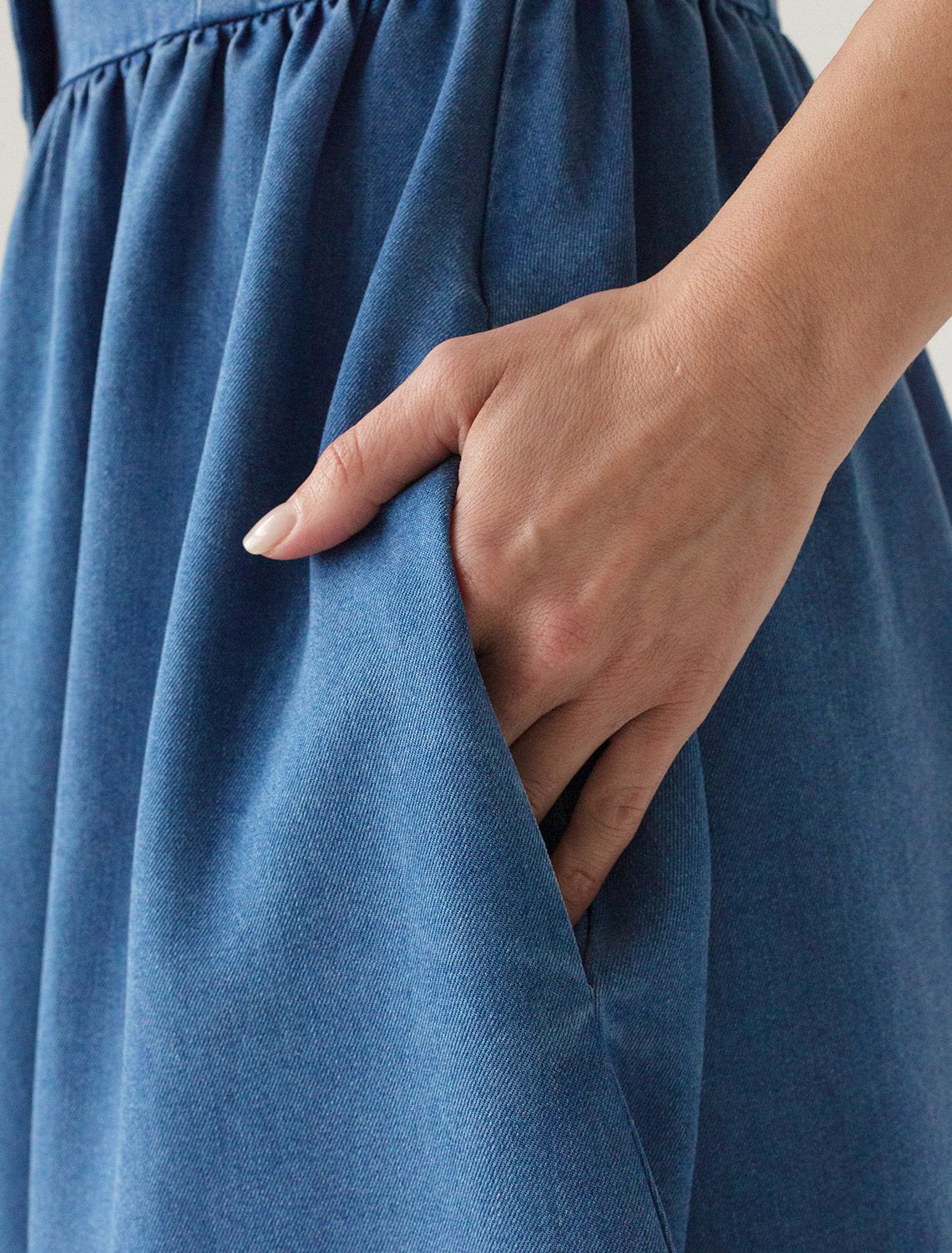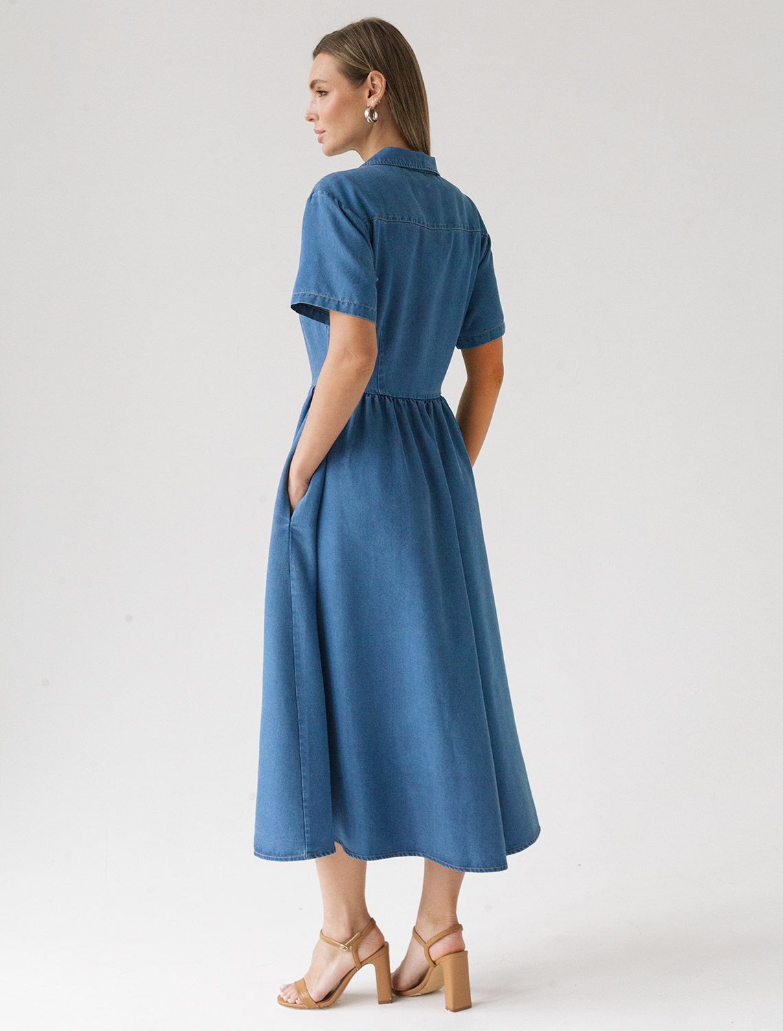 Платье выполнено из лиоцелла. Модель с английским воротником и пышной юбкой полусолнце дополнена пуговицами из натурального перламутра и боковыми карманами. Ткань с характерным атласным блеском полностью имитирует обычный деним, но в тоже время намного более мягкая, плавно струится по телу, хорошо драпируется и охлаждает кожу в жаркое время года.