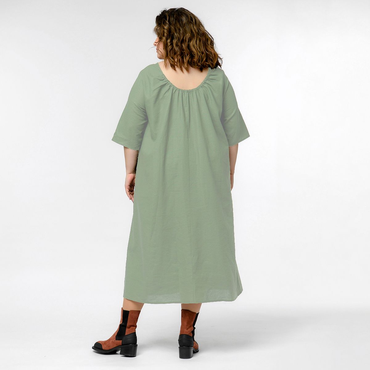 Платье свободного силуэта, из смесовой ткани, содержащей в составе лен и вискозу.  Боковые швы смещены на переднюю половинку платья, в них обработаны карманы.  Рукав втачной, свободный. Основным декоративным элементом является вырез горловины на спинке,в который вставлена резинка, образующая сборочку.