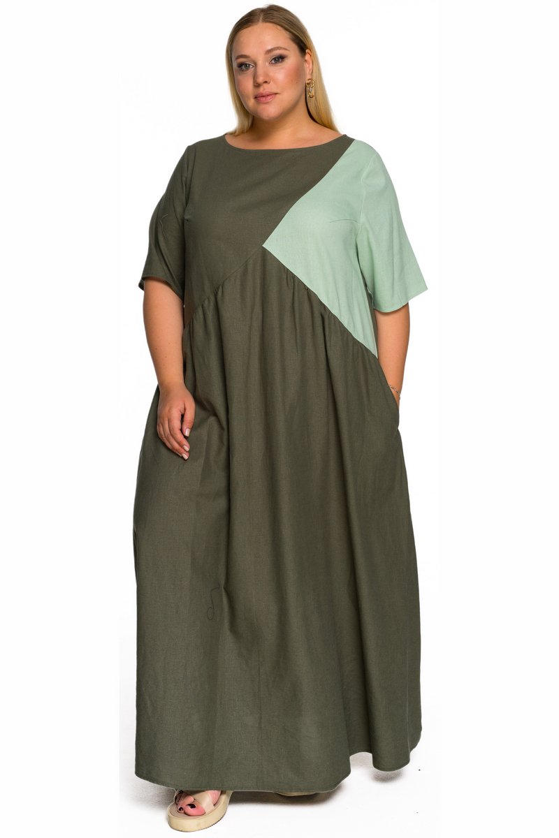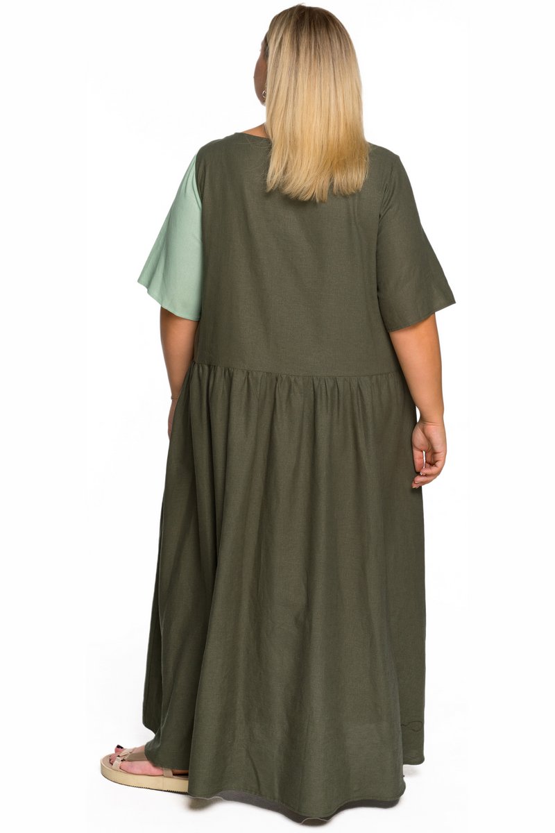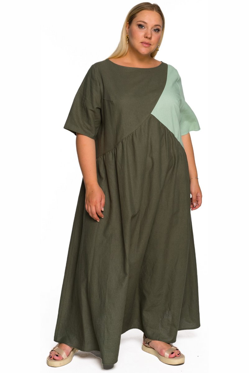 Платье длинное, свободного силуэта, из смесовой ткани, содержащей в составе лен и вискозу. Нижняя часть платья отрезная, присборенная. Линия подреза по переду фигурная, по спинке горизонтальная. Основной цвет хаки. Левая часть переда и левый рукав из отделочной ткани фисташкового оттенка такого же качества как основной материал.  В боковых швах карманы. Рукав втачной, свободный.