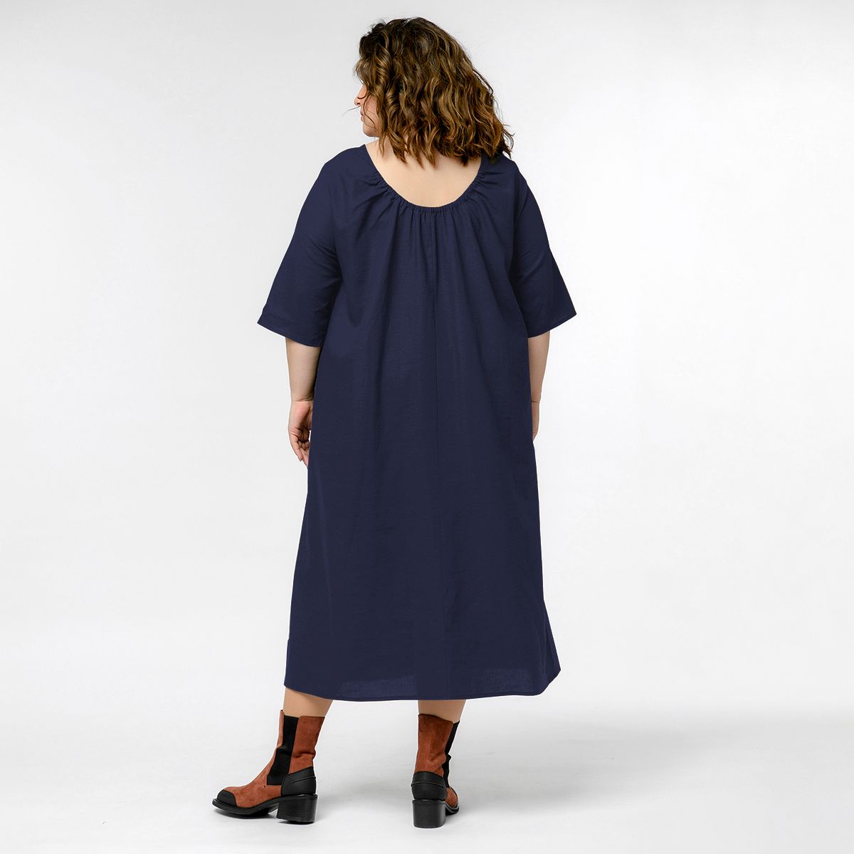 Платье свободного силуэта, из смесовой ткани, содержащей в составе лен и вискозу.  Боковые швы смещены на переднюю половинку платья, в них обработаны карманы.  Рукав втачной, свободный. Основным декоративным элементом является вырез горловины на спинке,в который вставлена резинка, образующая сборочку.