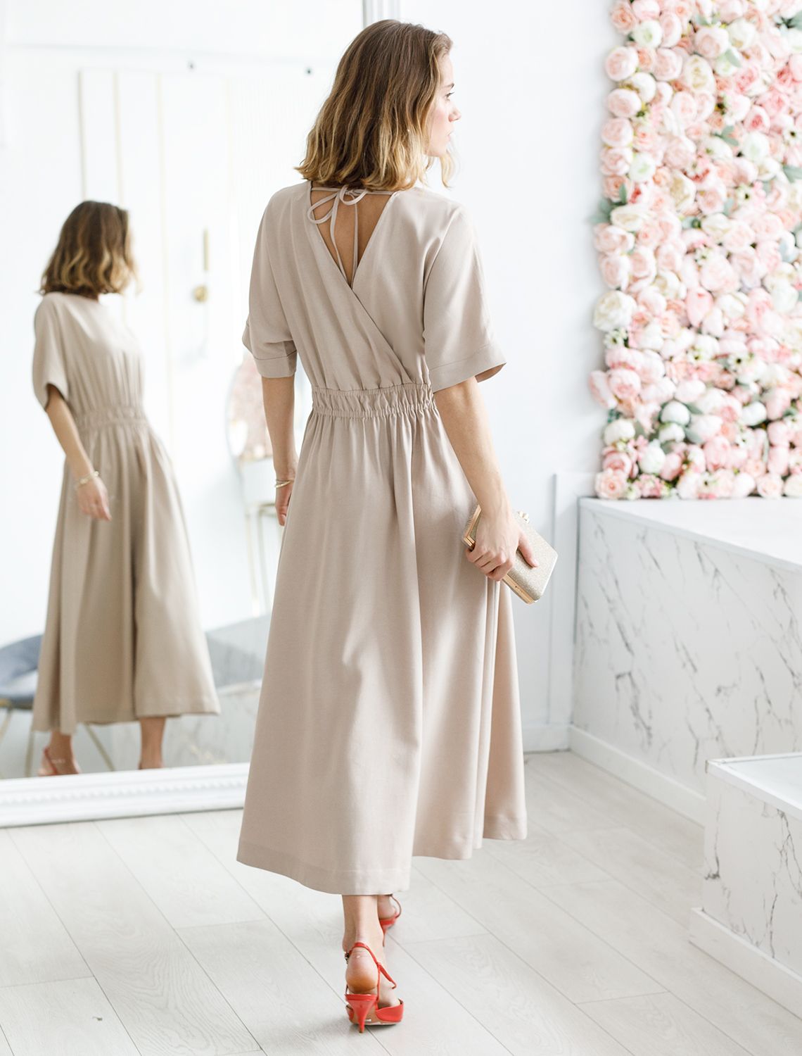 Платье выполнено из плотного лиоцелла. Модель с юбкой полусолнце и карманами дополнена эластичным поясом на талии. На спинке изделия вырез на запАх с лентами из основного полотна. Ткань хорошо держит форму, плавно драпируется и не просвечивает. В теплое время года приятно охлаждает кожу. Добавление синтетических волокон в составе изделия, предотвращает сминаемость и поддерживает формоустойчивость.