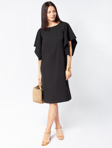 Платье с глубоким V-вырезом и рукавом «летучая мышь» выполнено из тончайших нитей плотного сатина, плетение которых создает полуматовый блеск, напоминающий натуральный шёлк. Модель с длинными глубокими вытачками спереди и сзади выглядит скульптурно, но за счет струящейся ткани сохраняется плавность силуэта. Ткань почти не мнется и имеет легкий вес. Комфортная длина ниже колена и застежка на молнию. ультрамарин