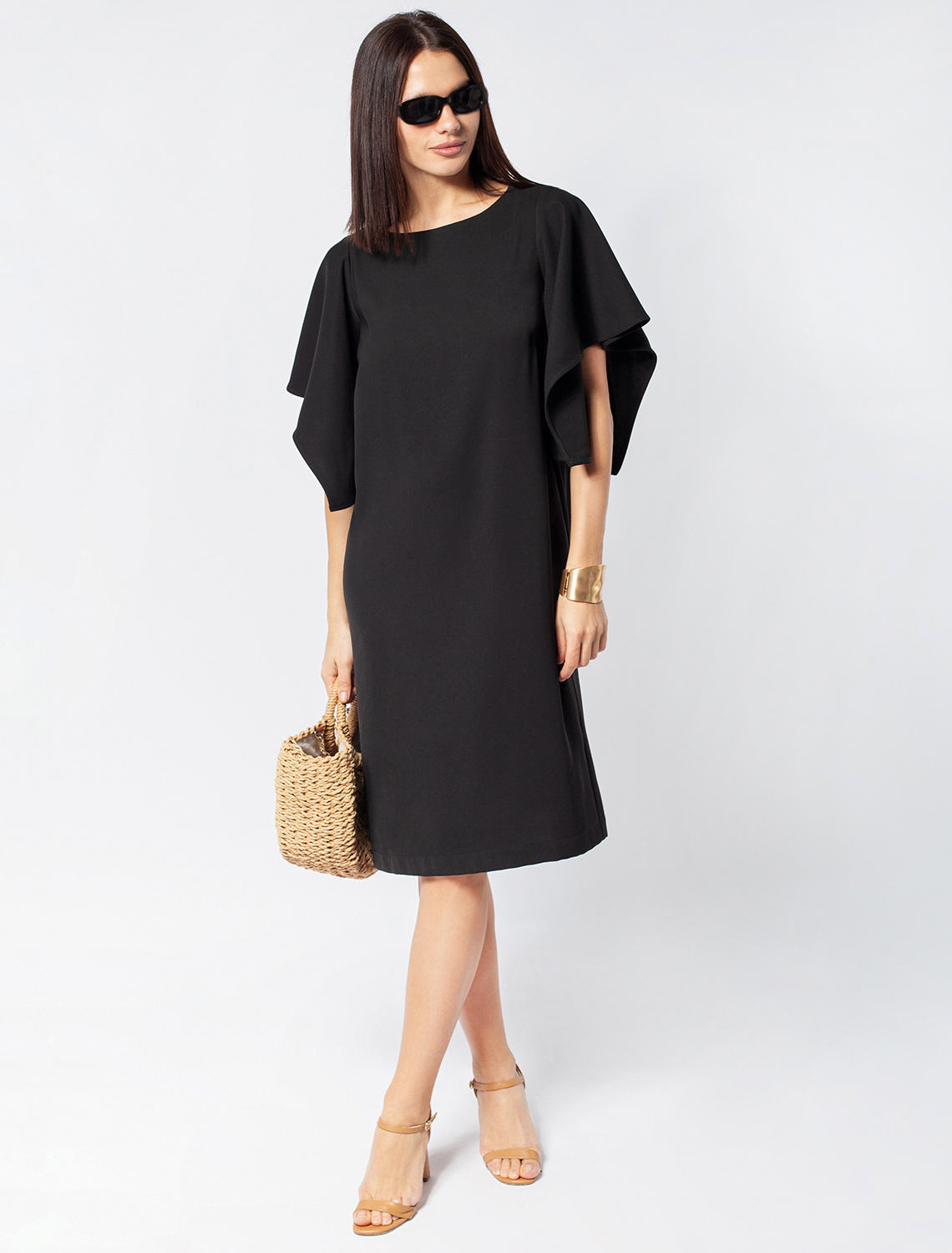 Платье из плотного струящегося крепа прямого кроя с «парящими» рукавами. Фасон платья сбалансирует любой тип фигуры: прямой свободный крой, универсальная длина подола – чуть ниже колена, широкая пройма и акцентные рукава. Классический О-образный вырез фиксируется сзади изящной золотой пуговицей. Материал почти не мнется и комфортен в носке. черный