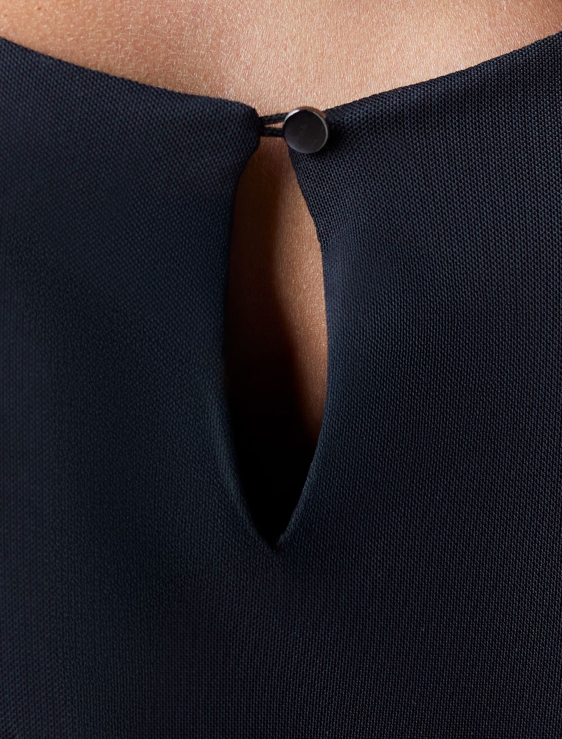 Элегантное платье прямого кроя черного цвета выполнено из воздушной сетчатой ткани с прозрачными рукавами, придающими образу лёгкую игривость. Мягкая вискозная подкладка обеспечивает комфорт, сохраняя при этом эффект полупрозрачности. Универсальный черный цвет делает платье идеальным для базового гардероба. черный