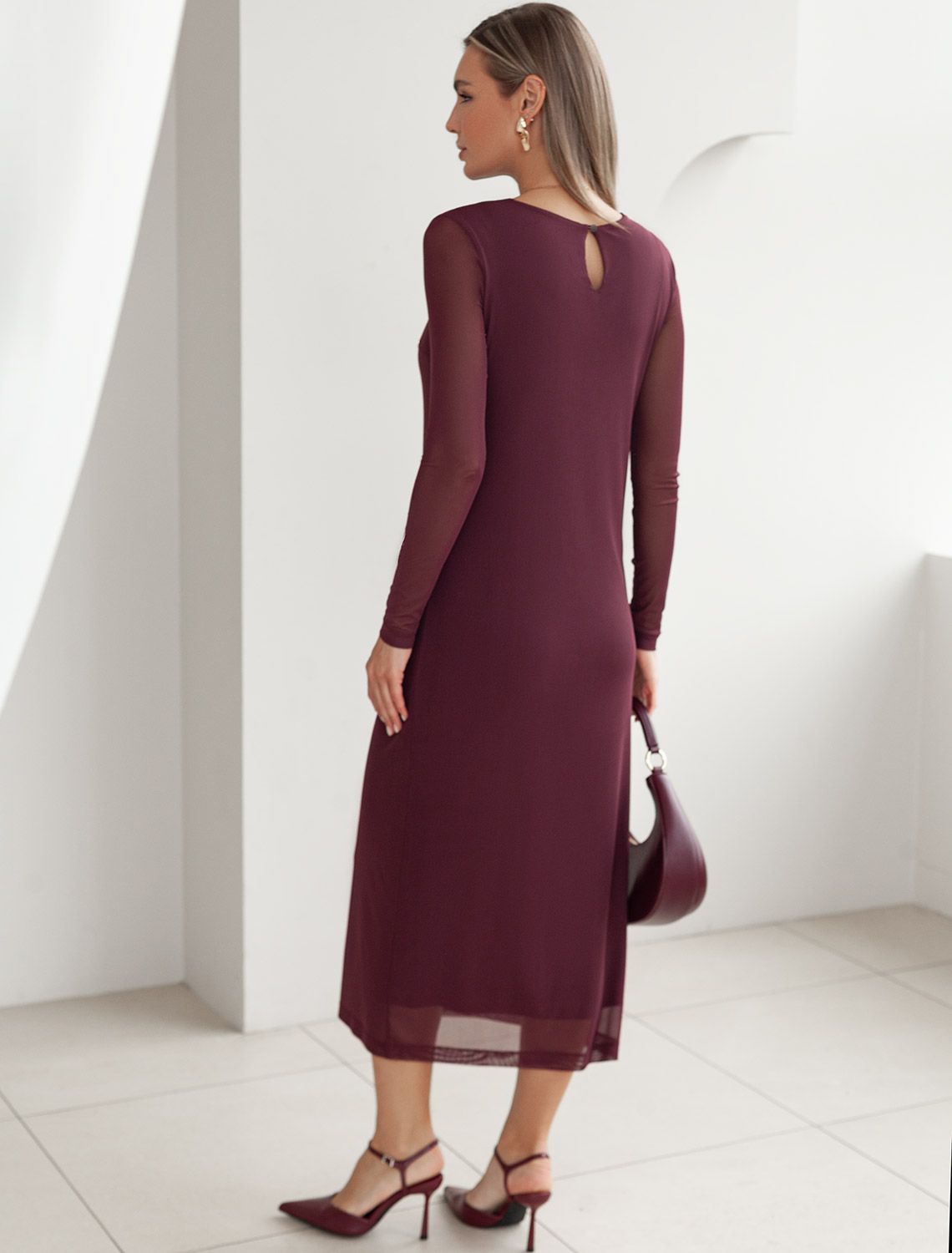 Роскошная модель в глубоком бордовом цвете из мягкой сетчатой ткани с прозрачными рукавами, придающими образу лёгкую игривость. Мягкая вискозная подкладка обеспечивает комфорт, сохраняя при этом эффект полупрозрачности. Прямой силуэт подчеркивает женственность. Идеально для вечерних выходов и особых случаев.