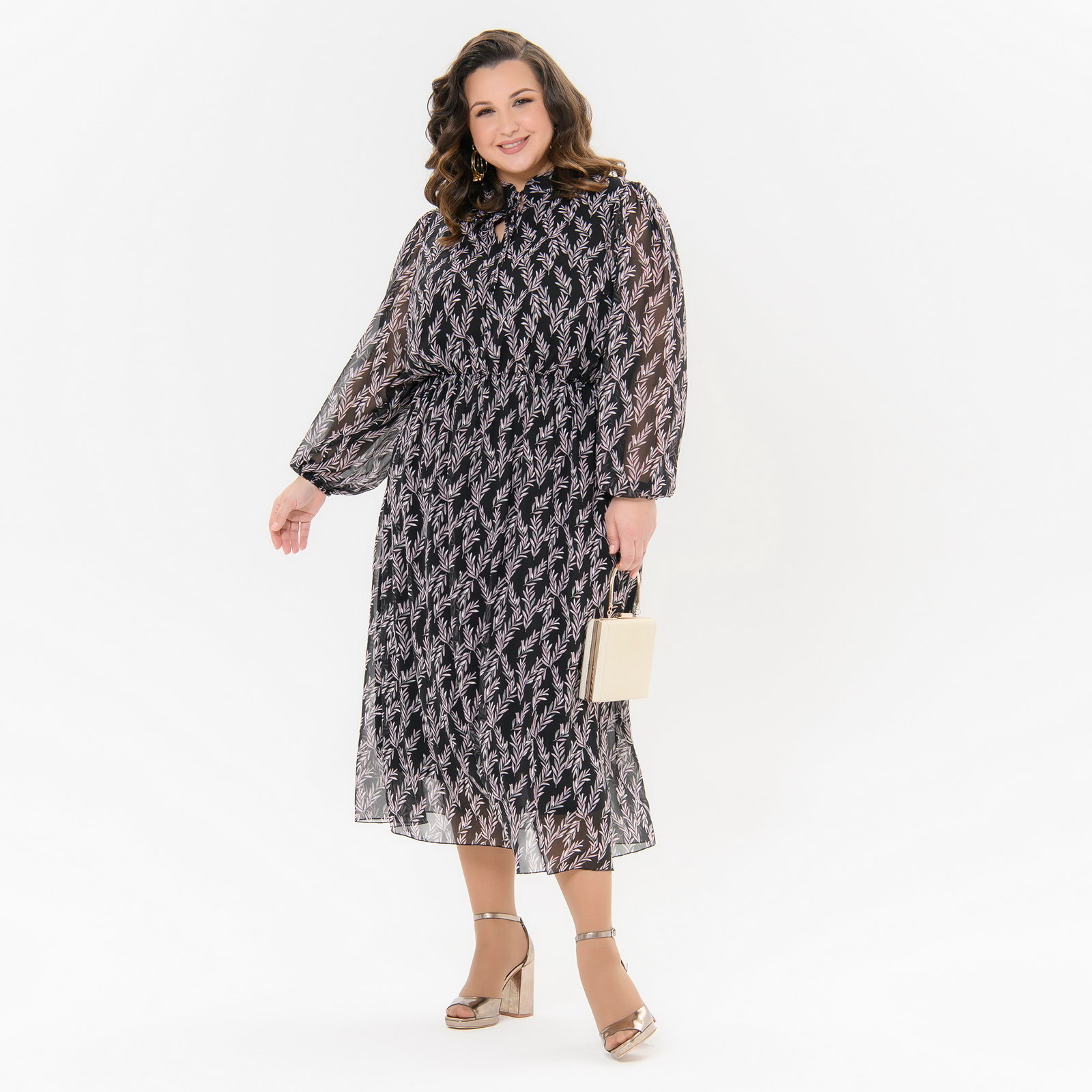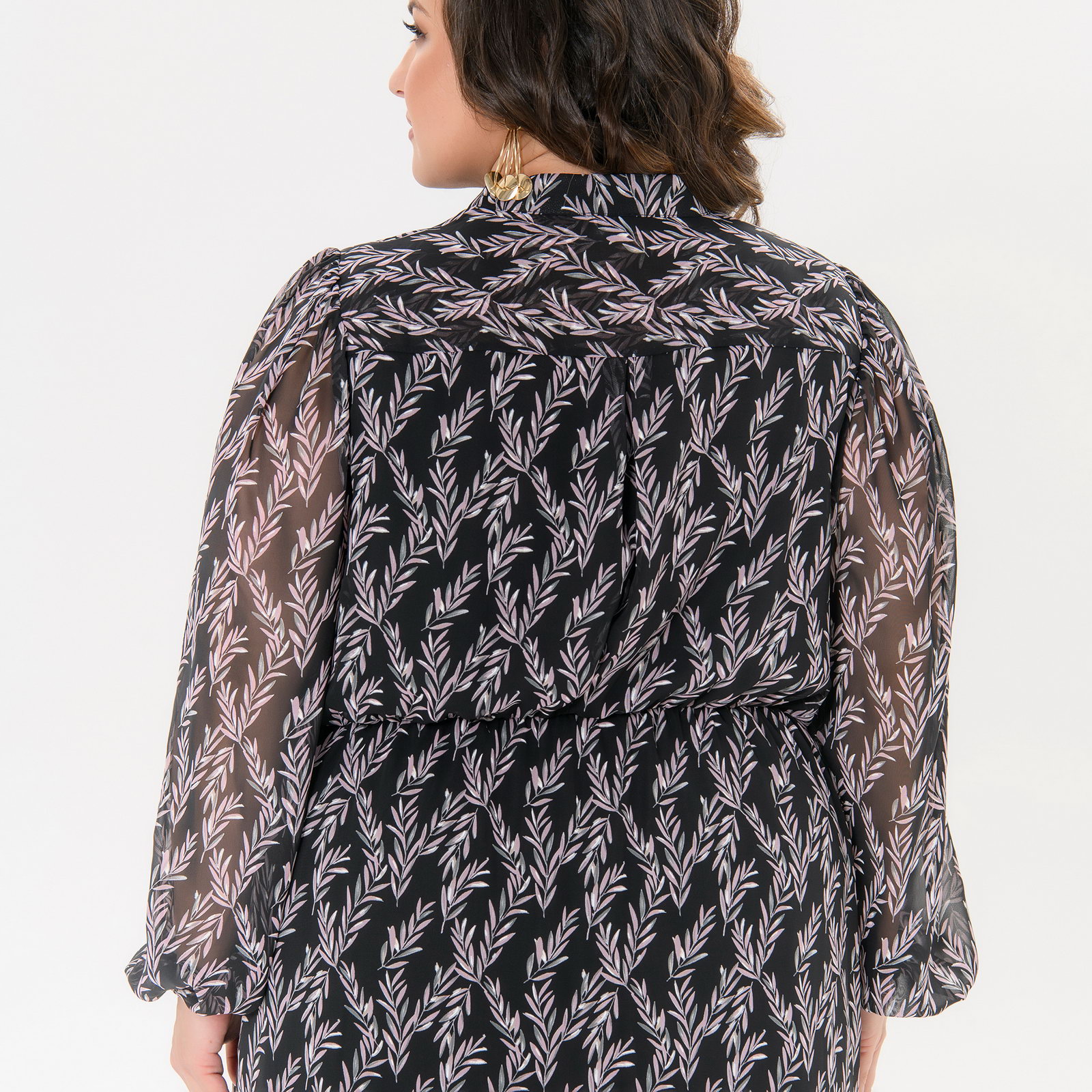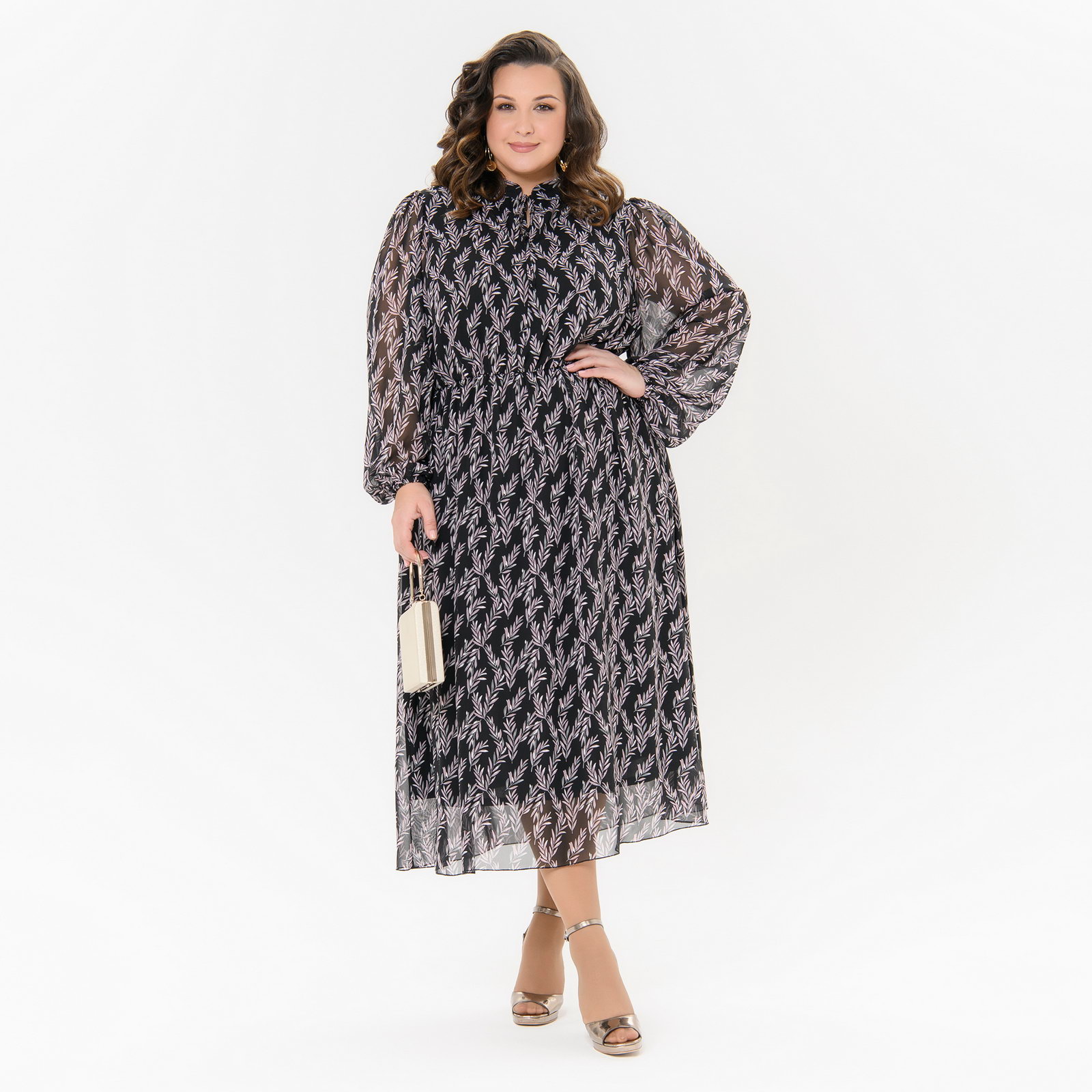 Платье из шифона с воротником "стоечка", черное, принт"веточки"