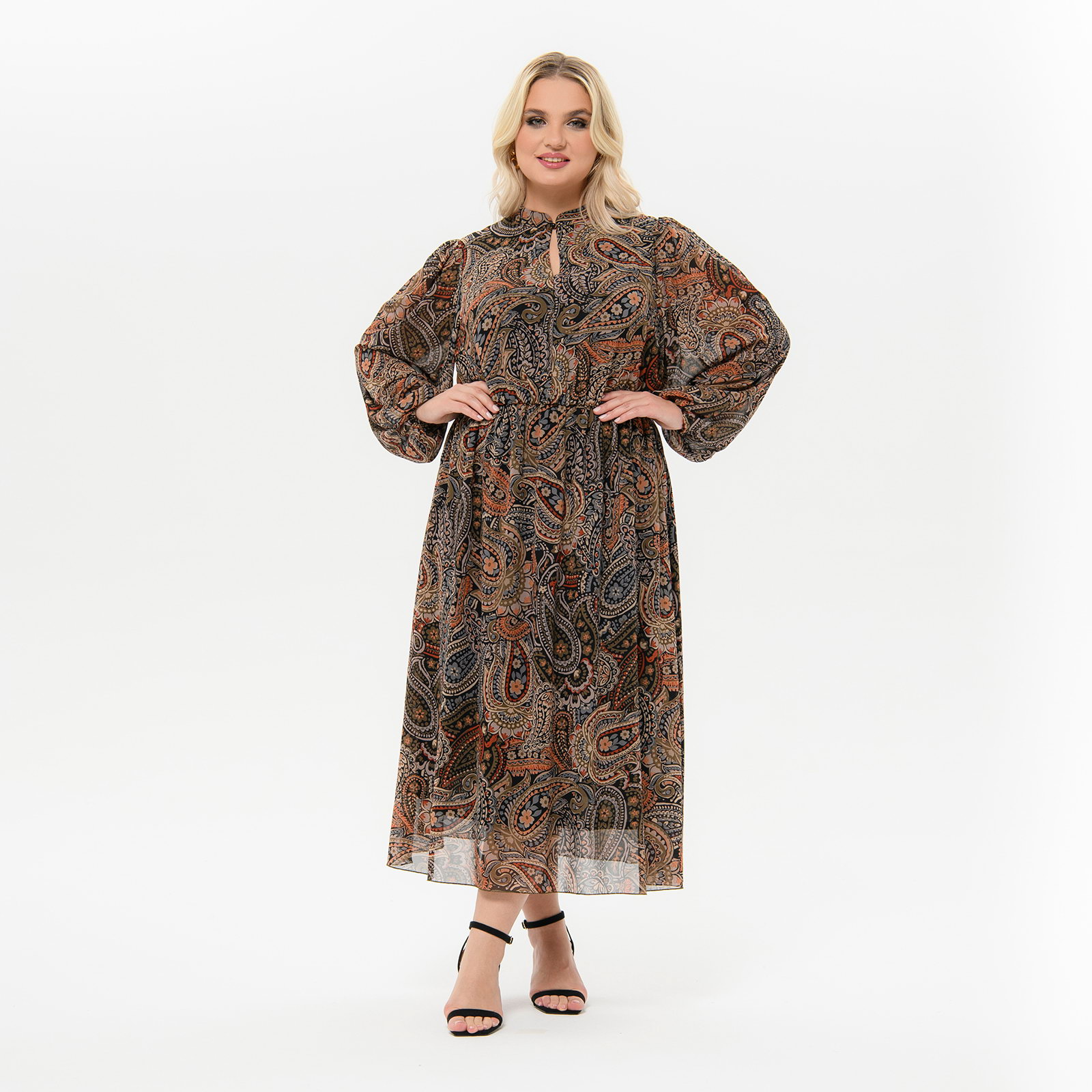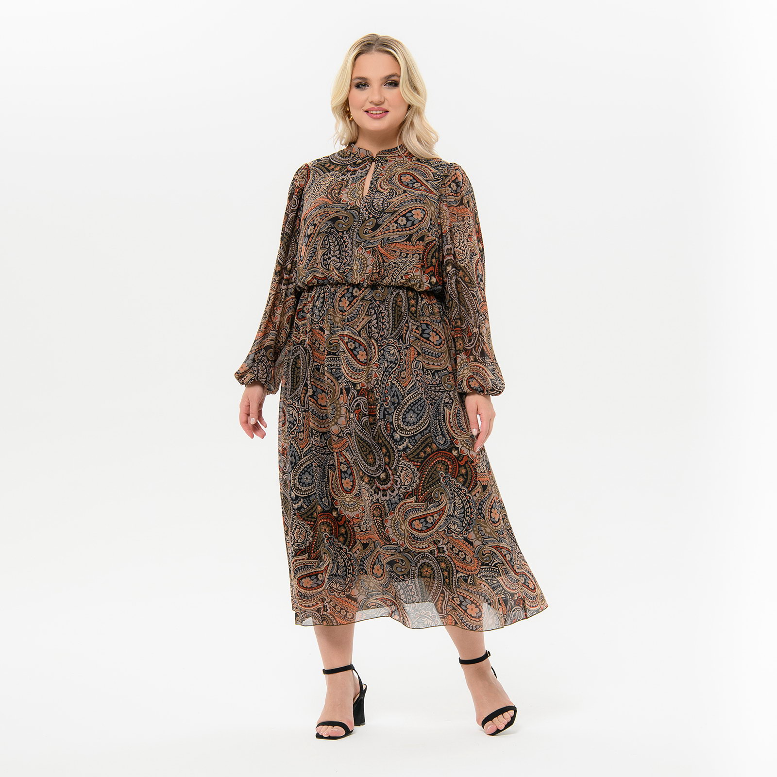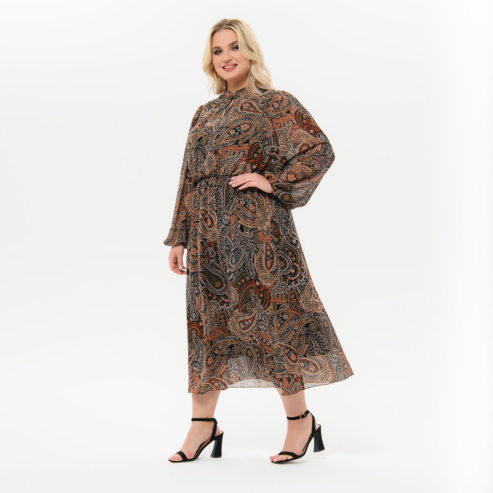 Платье из шифона с воротником "стоечка", принт "индийский"