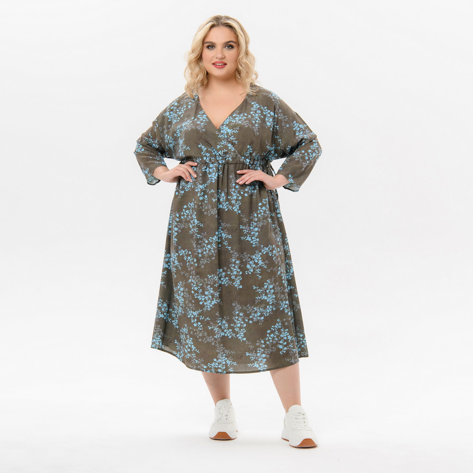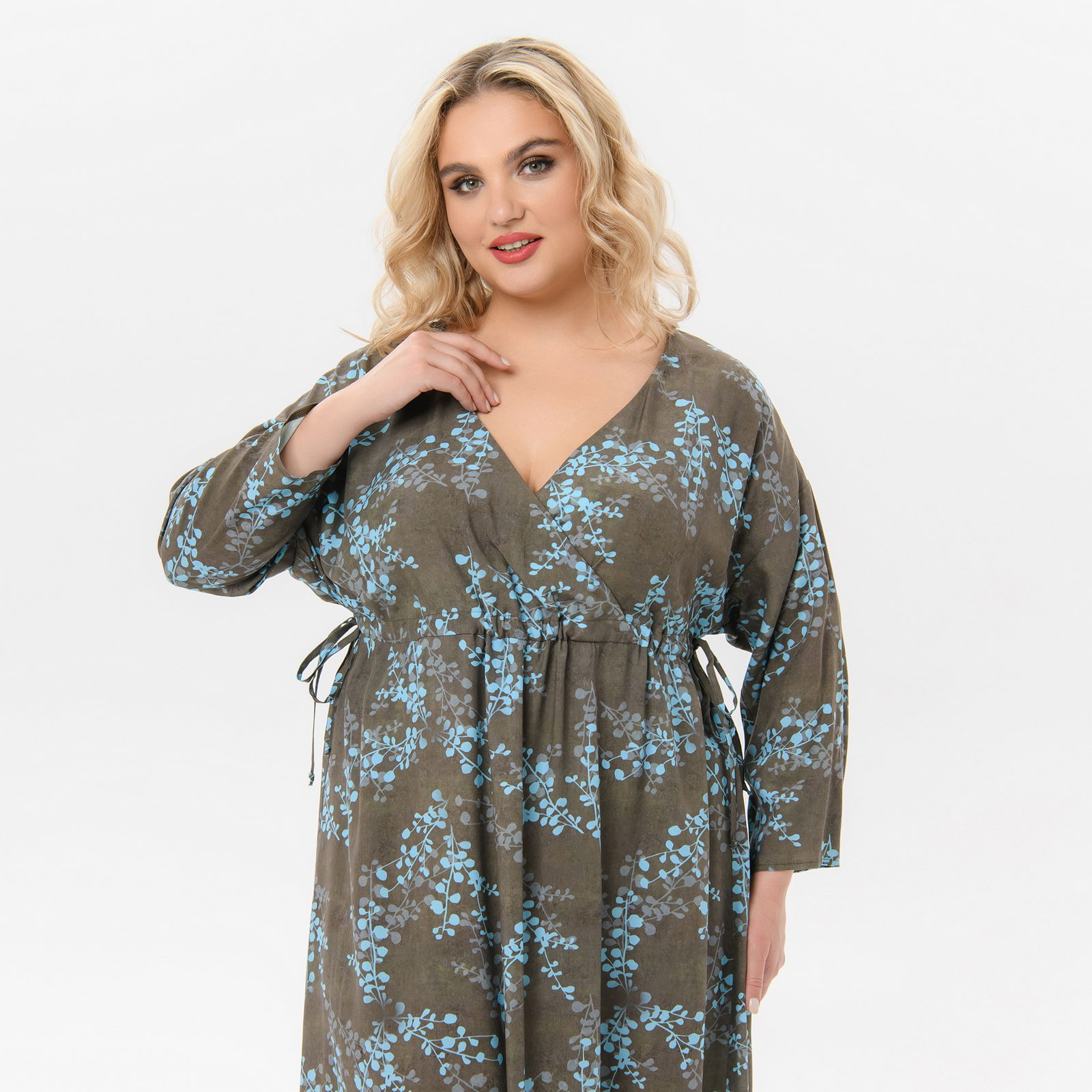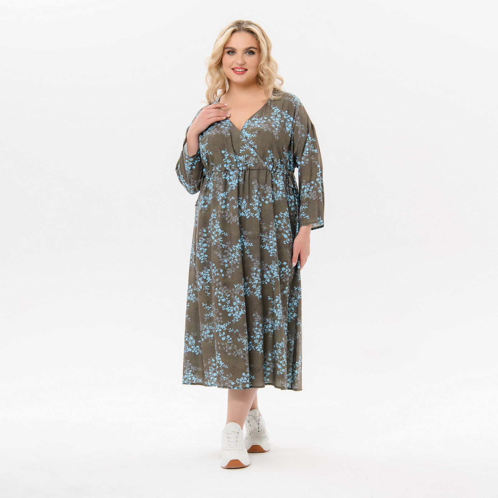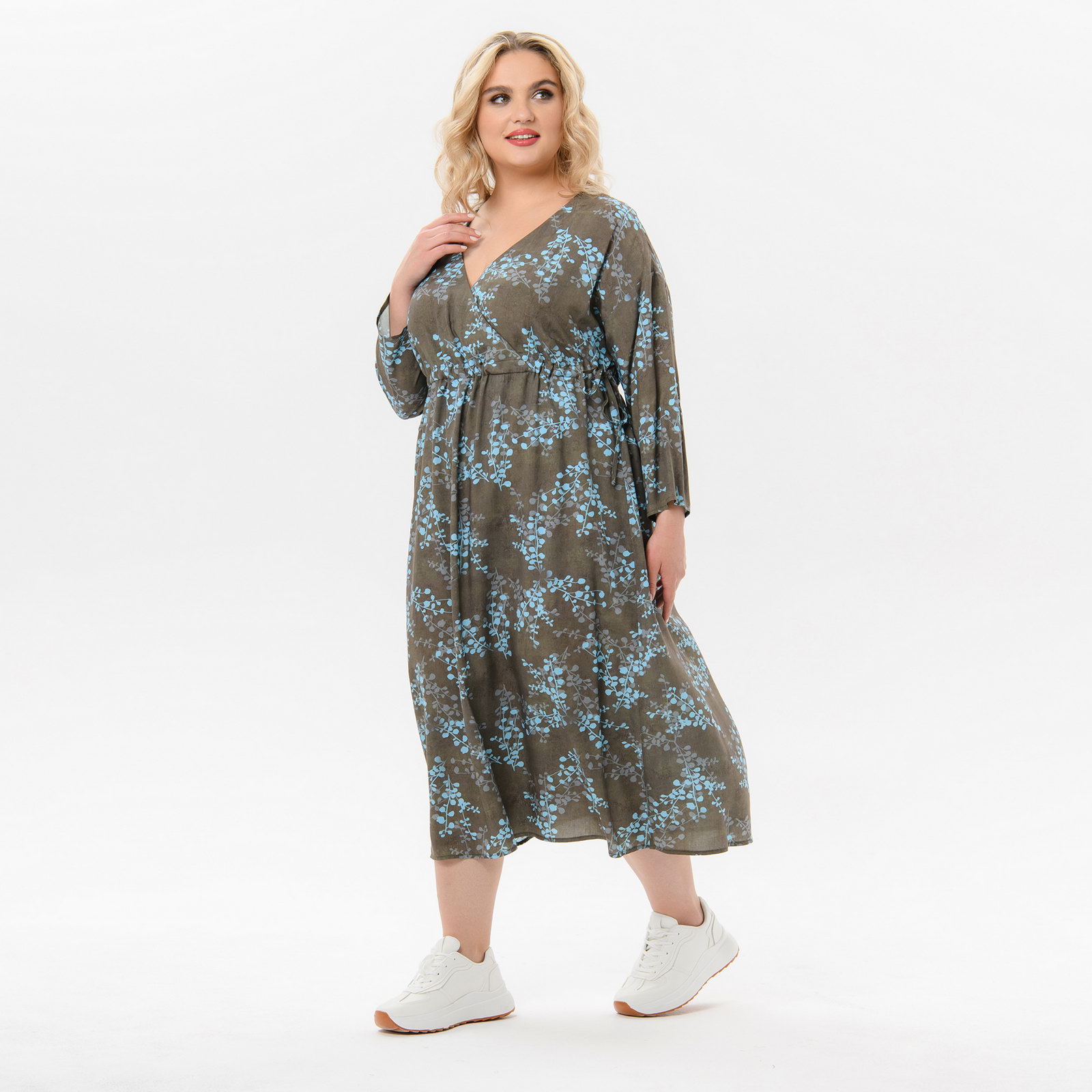 Платье из штапеля, лиф с запАхом, с кулисами под линией груди, "хаки с бирюзой"