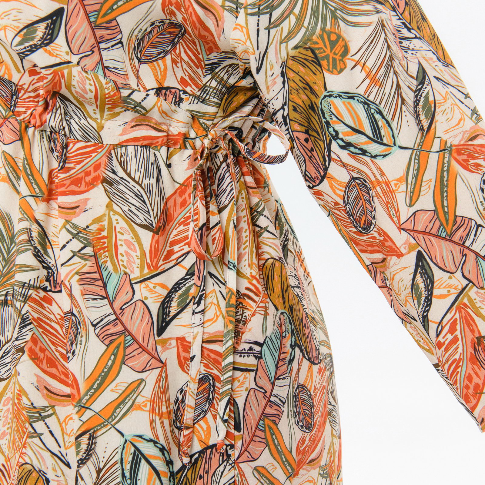 Платье из штапеля, лиф с запАхом, с кулисами под линией груди, принт "бежевые листья" *