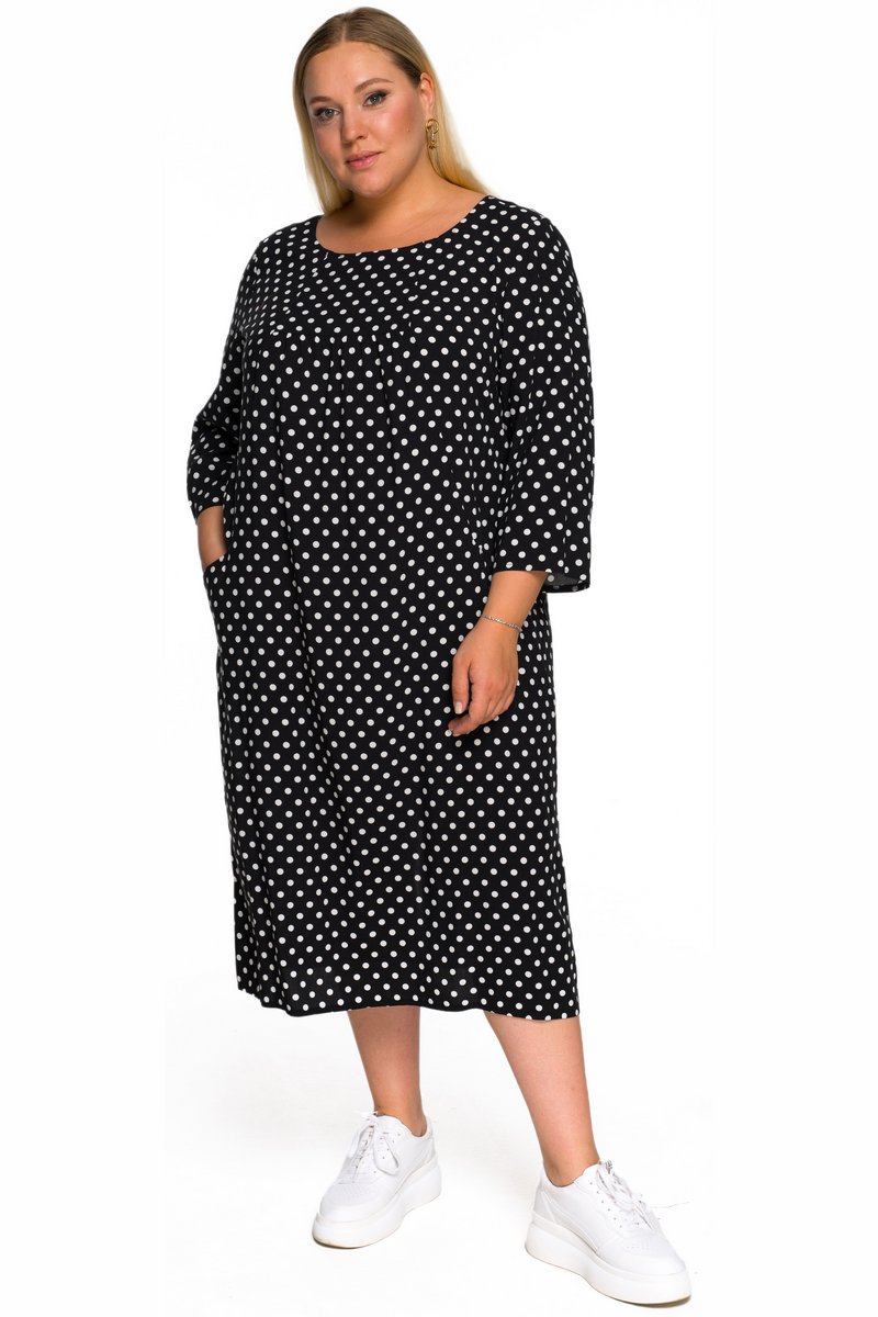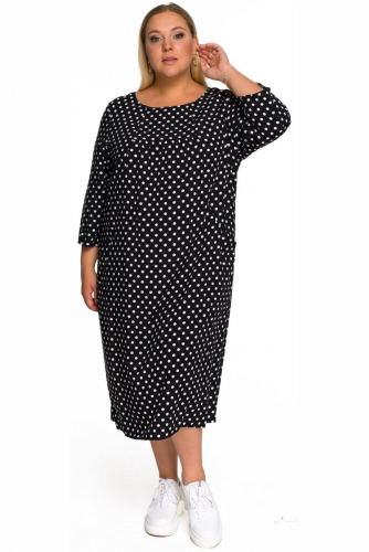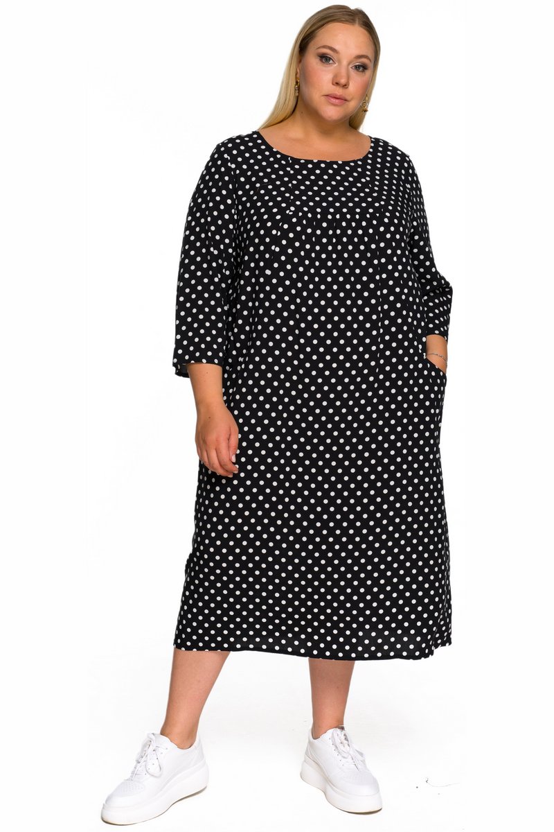 Платье из штапеля прямого силуэта. Вырез горловины округлый. По переду фигурные рельефные швы, в которых обработаны карманы.