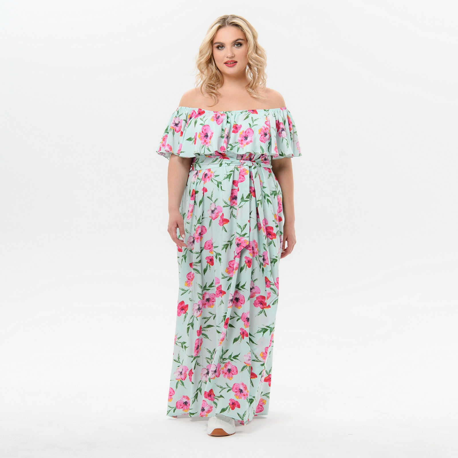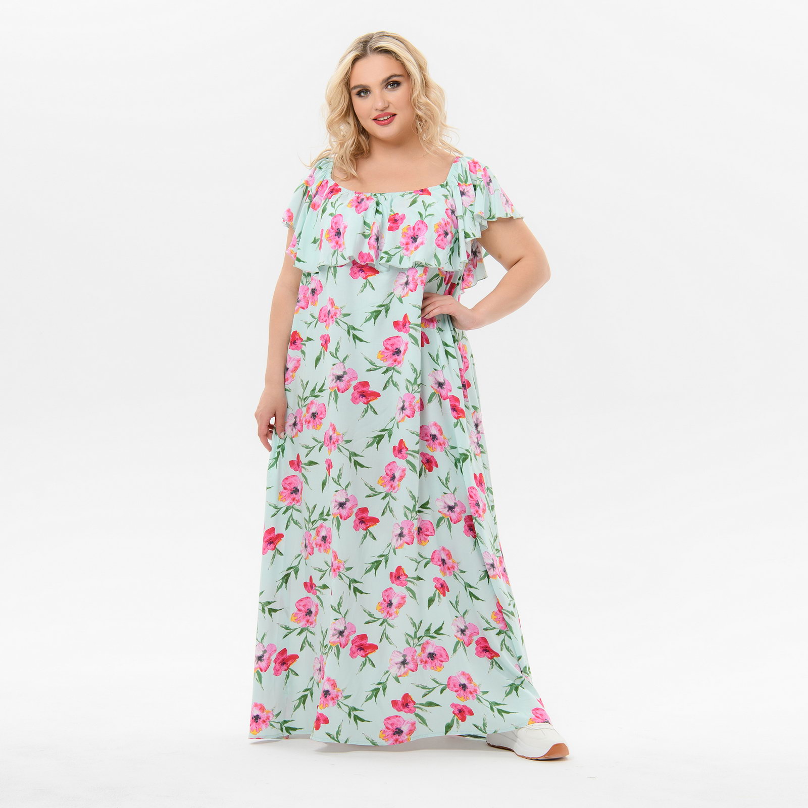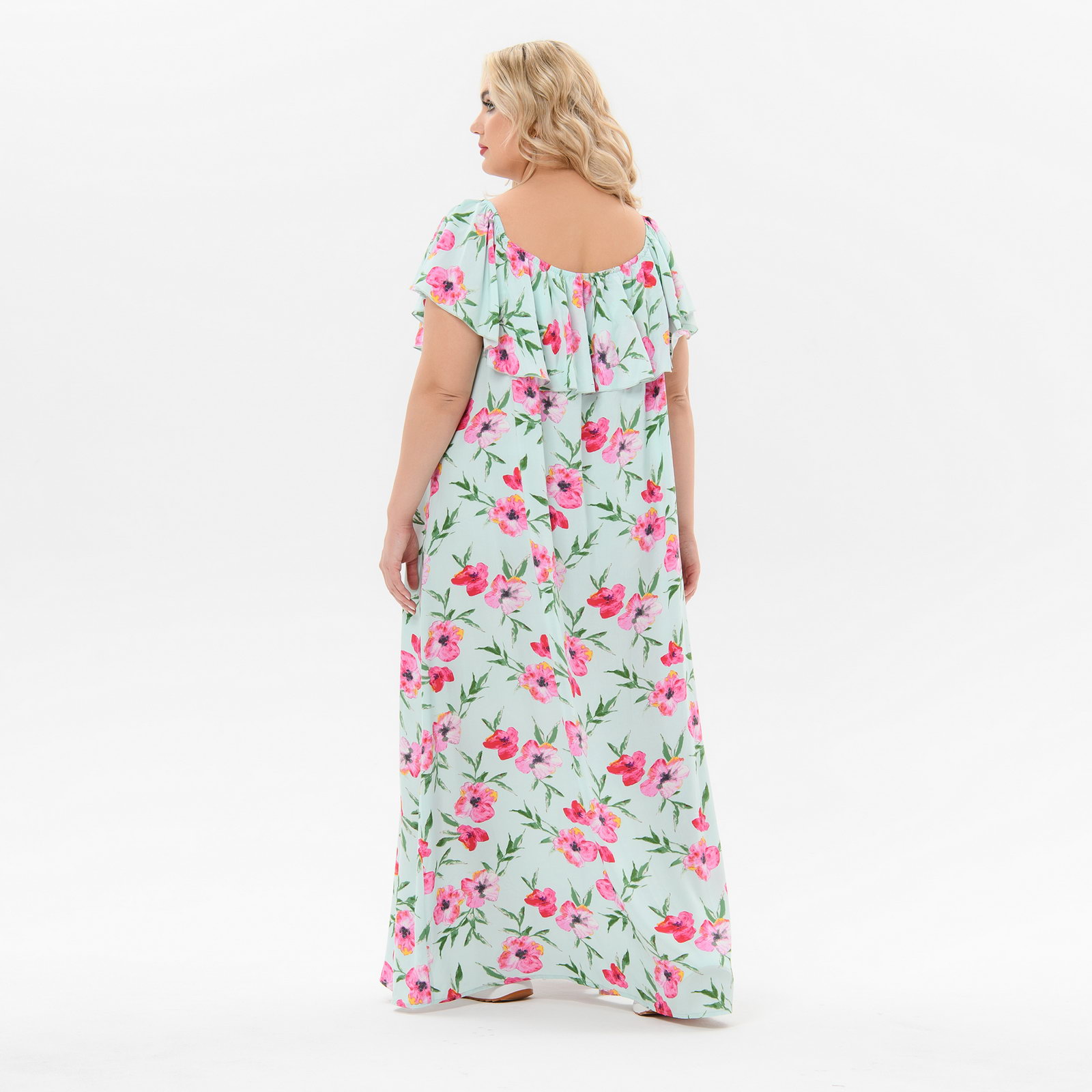 Летнее длинное платье из принтованного штапеля с воланом по верху. Линия горловины переда и спинки расширена, собрана на резинку вместе с воланом.