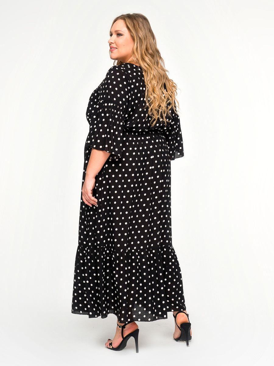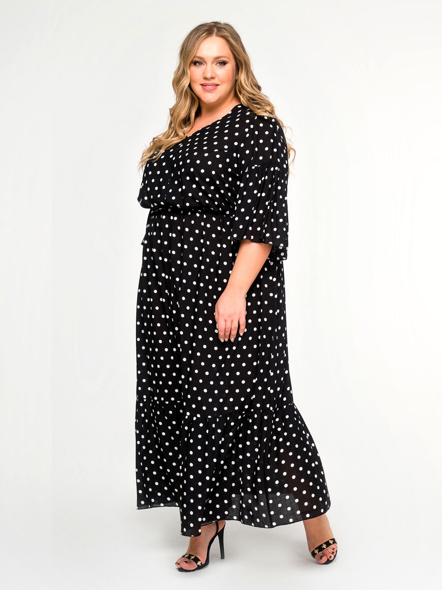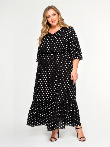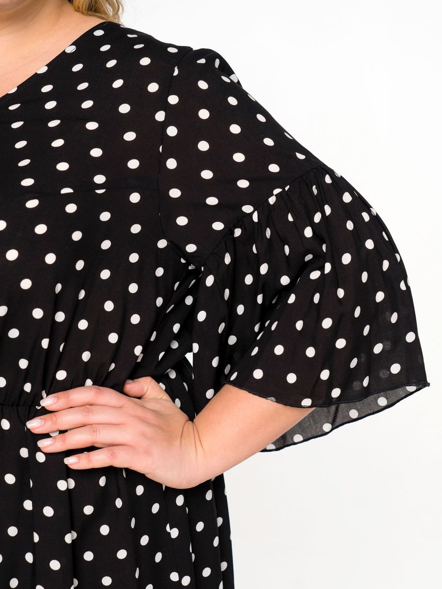 Свободное платье из принтованного штапеля. Верхняя часть отрезная с небольшим напуском, зафиксированным резинкой по талии. Нижняя часть юбки отрезная, присборенная. Свободный рукав из 2-х частей. Горловина с V-вырезом.
