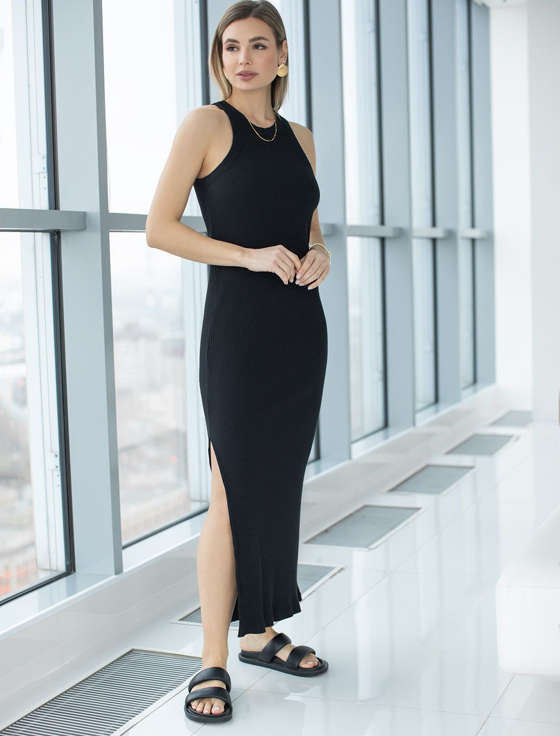 Платье выполнено из трикотажа в широкий рубчик. Модель дополнена высоким разрезом сбоку. Эластичный хлопковый трикотаж идеально сидит по фигуре, не сковывает движений и очень комфортный в носке. Фактура вертикальных полос визуально стройнит и вытягивает силуэт. Изделие хорошо впишется как в повседневный гардероб, так и для вечерних аутфитов.