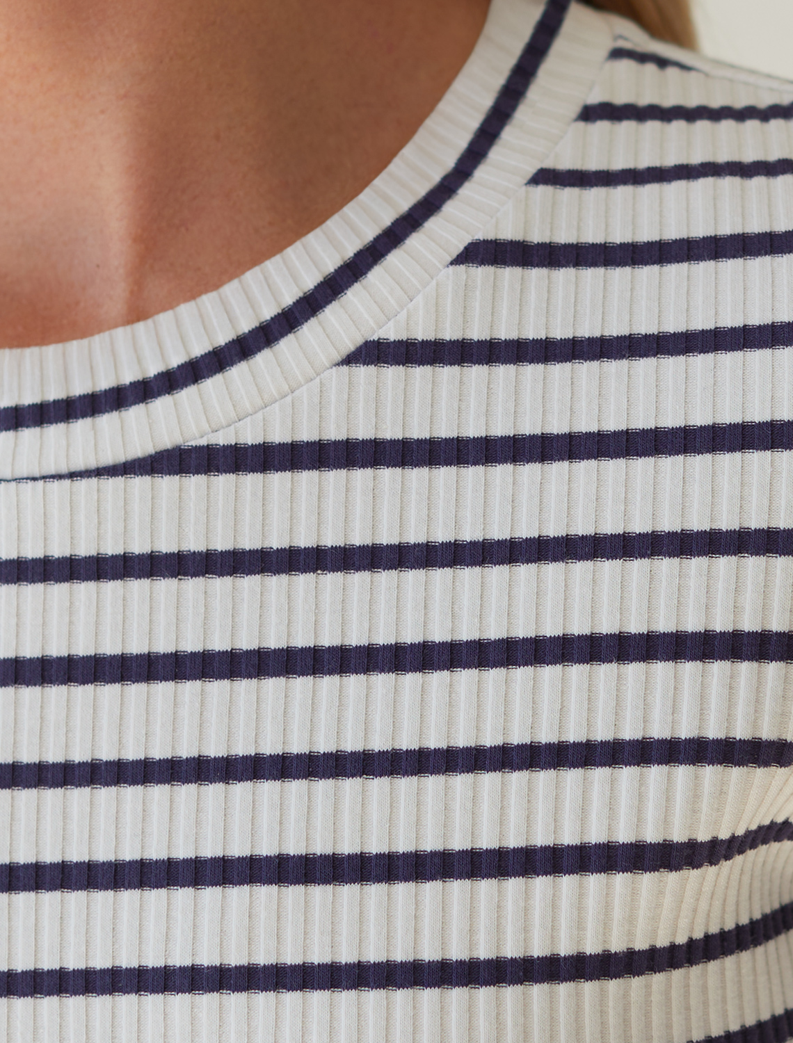 Платье длины миди из мягкого трикотажа выполнено широкий рубчик. Благодаря добавлению эластана материал обладает высокой формоустойчивостью, что обеспечивает комфорт при носке и сохранение первоначального вида после длительного использования. Полуприлегающая посадка подчеркивает фигуру, а длина рукава до локтя делает модель универсальной для любого времени года. Разрезы по бокам добавляют изящности и свободы движений, делая образ женственным и утонченным. Платье станет отличным выбором для создания разнообразных образов — от классического до повседневного стиля. Оно легко комбинируется с аксессуарами и обувью, позволяя вам экспериментировать с модными решениями. кокосовый-т.синий
