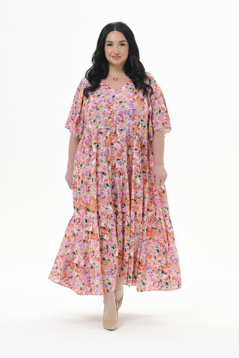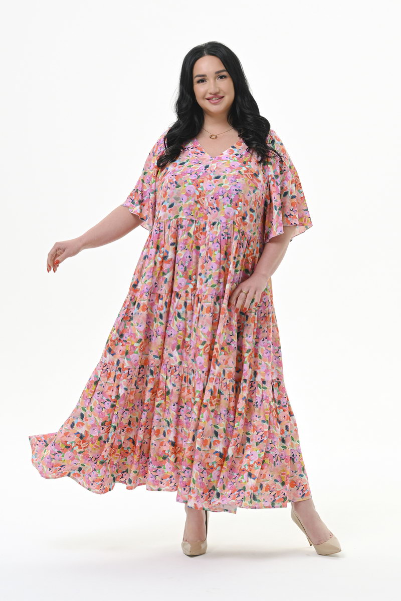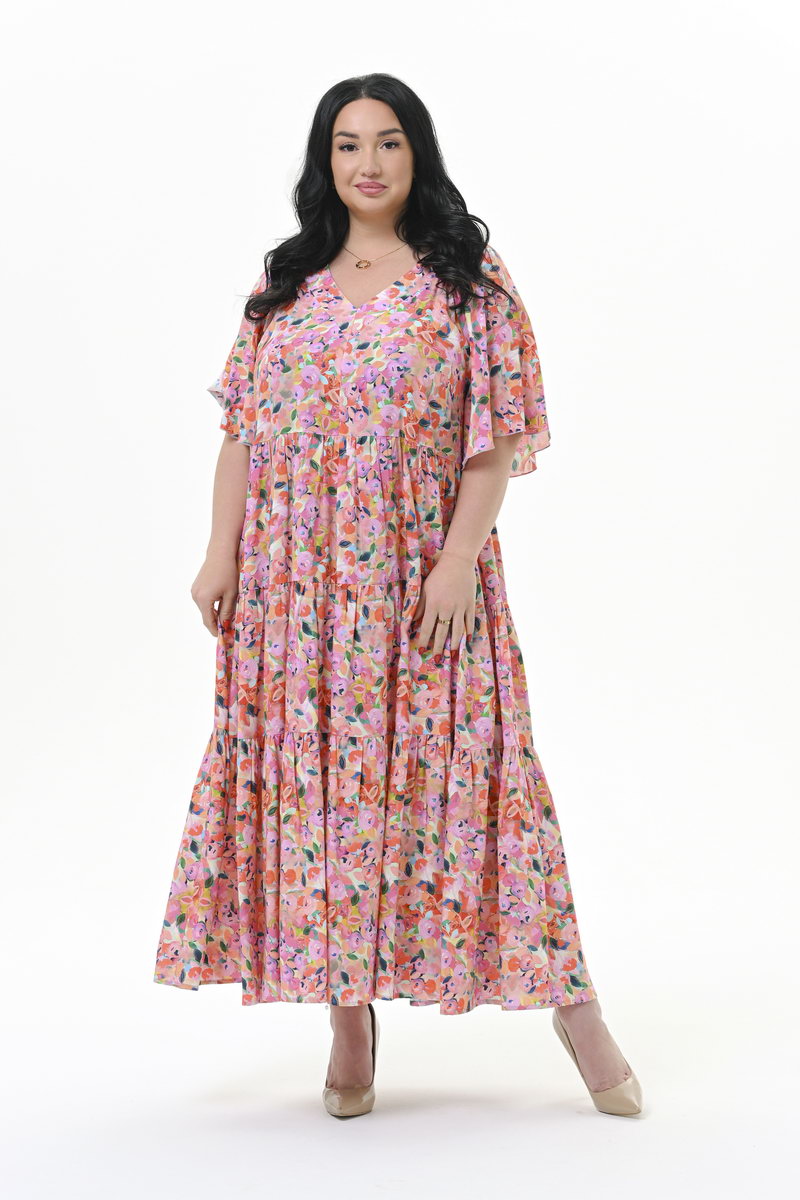 Платье каскадное, с V-вырезом, штапель, принт "розы" *