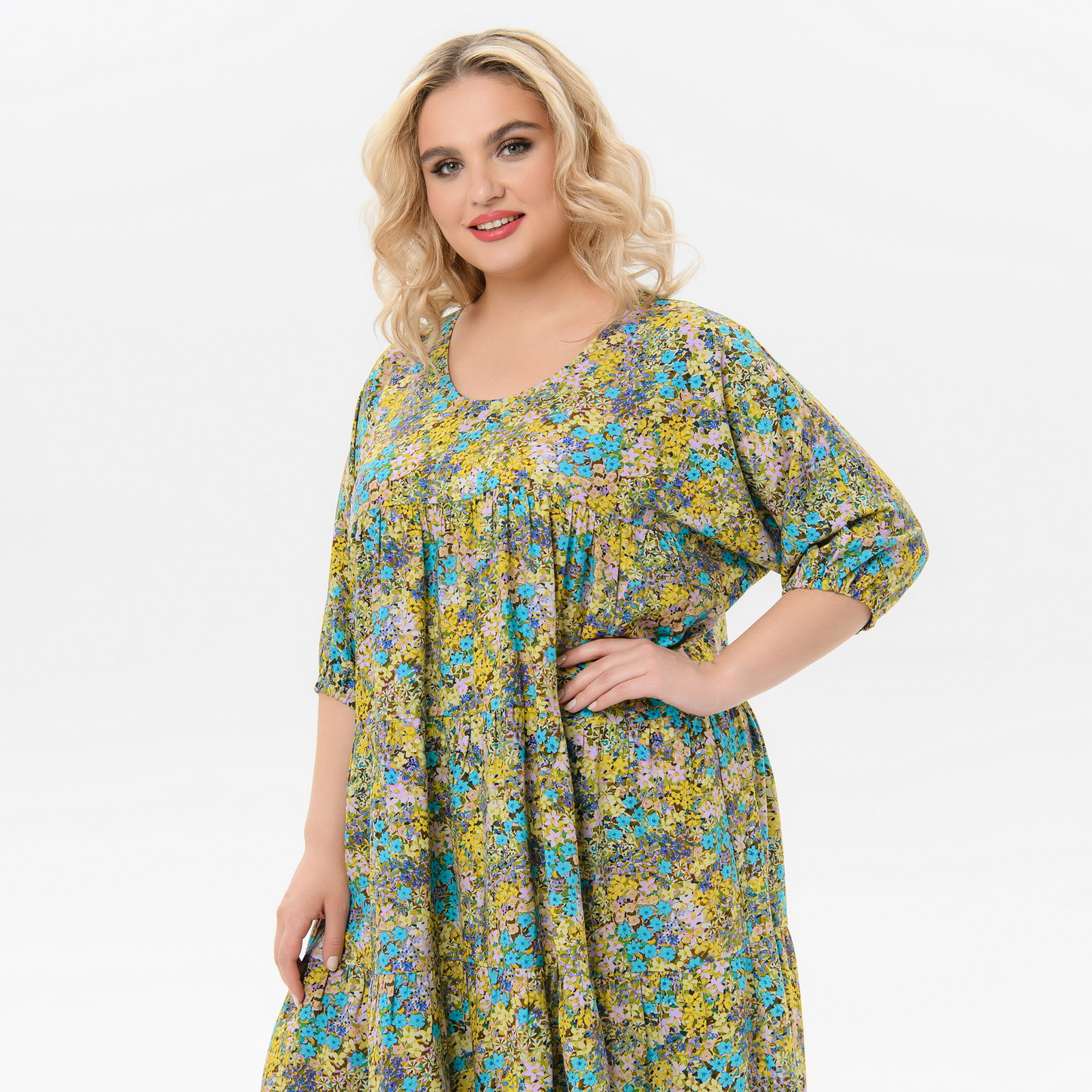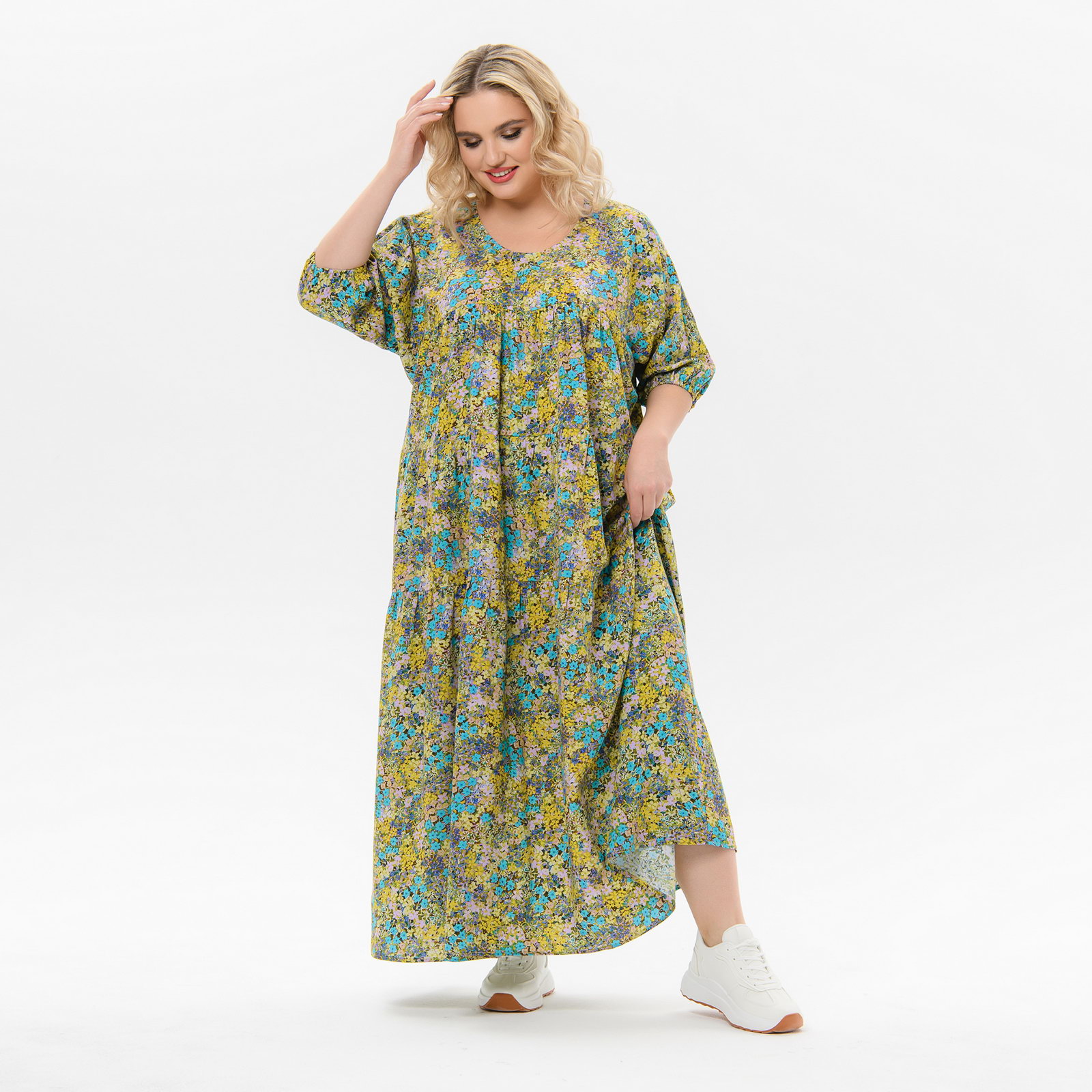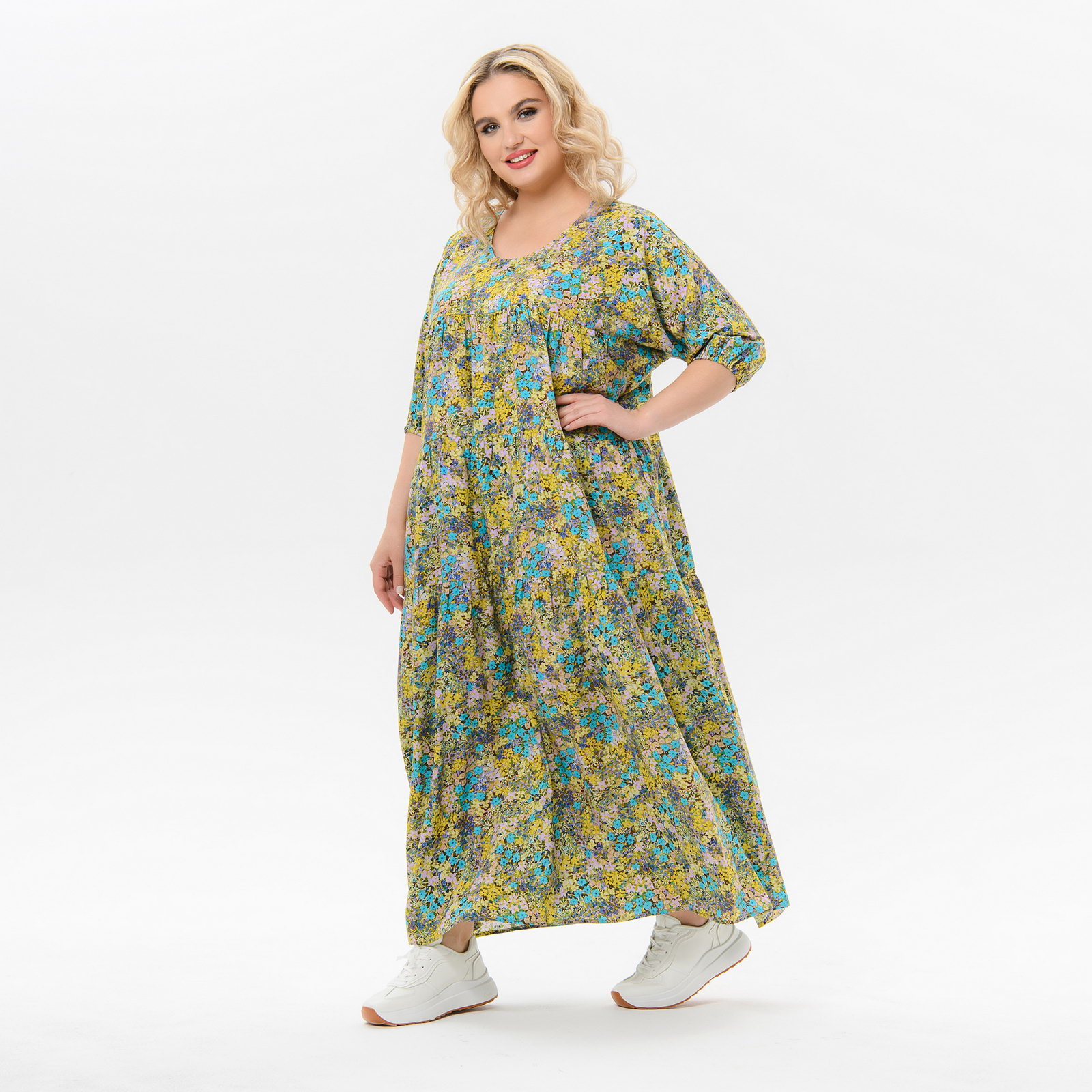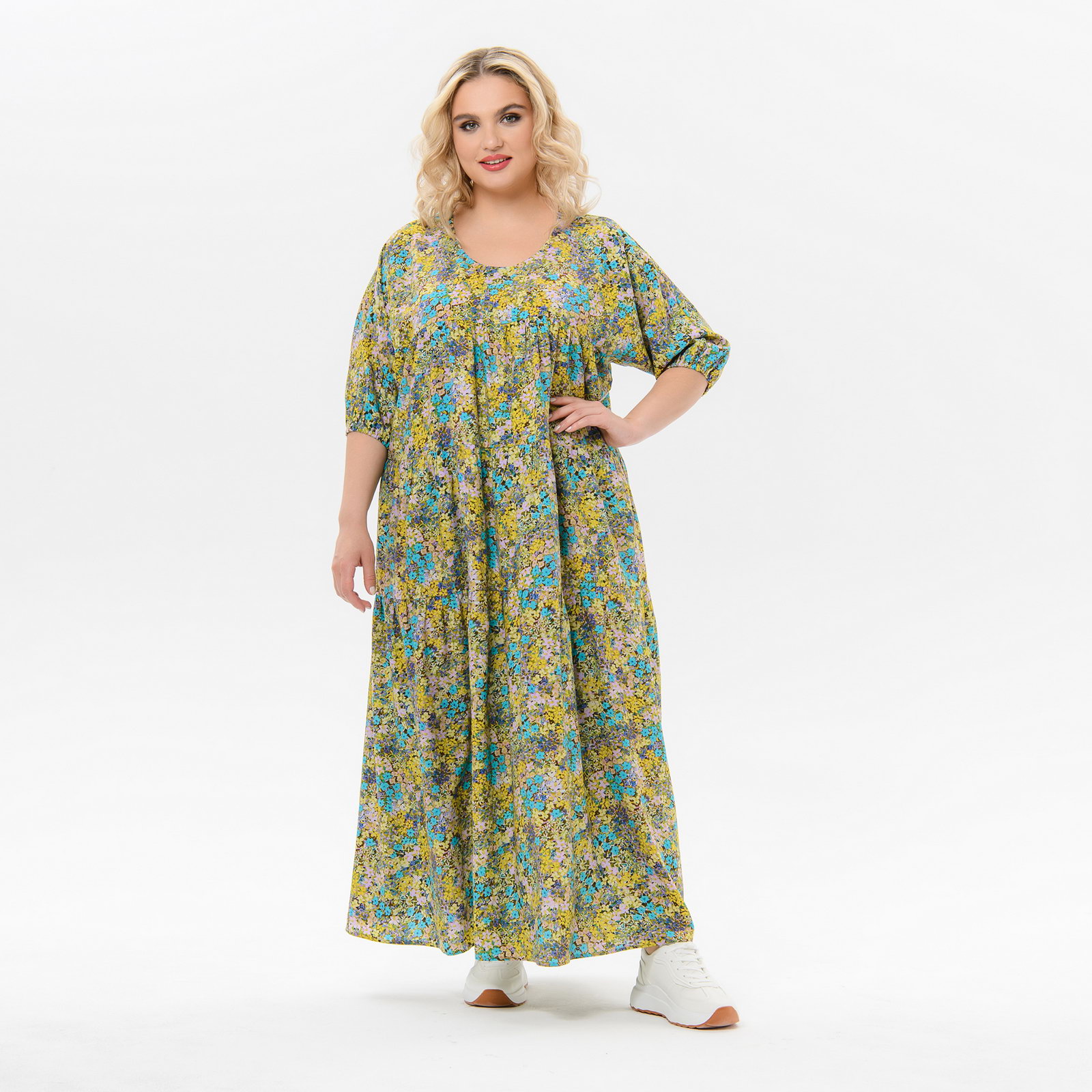 Платье длинное из штапеля свободного силуэта. Отрезное по линии груди, нижняя часть платья присборена. Рукав закрывает локоть, низ рукава на резинке. Вырез горловины округлый.