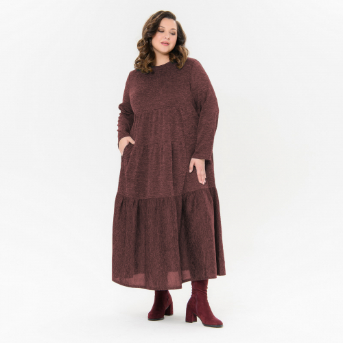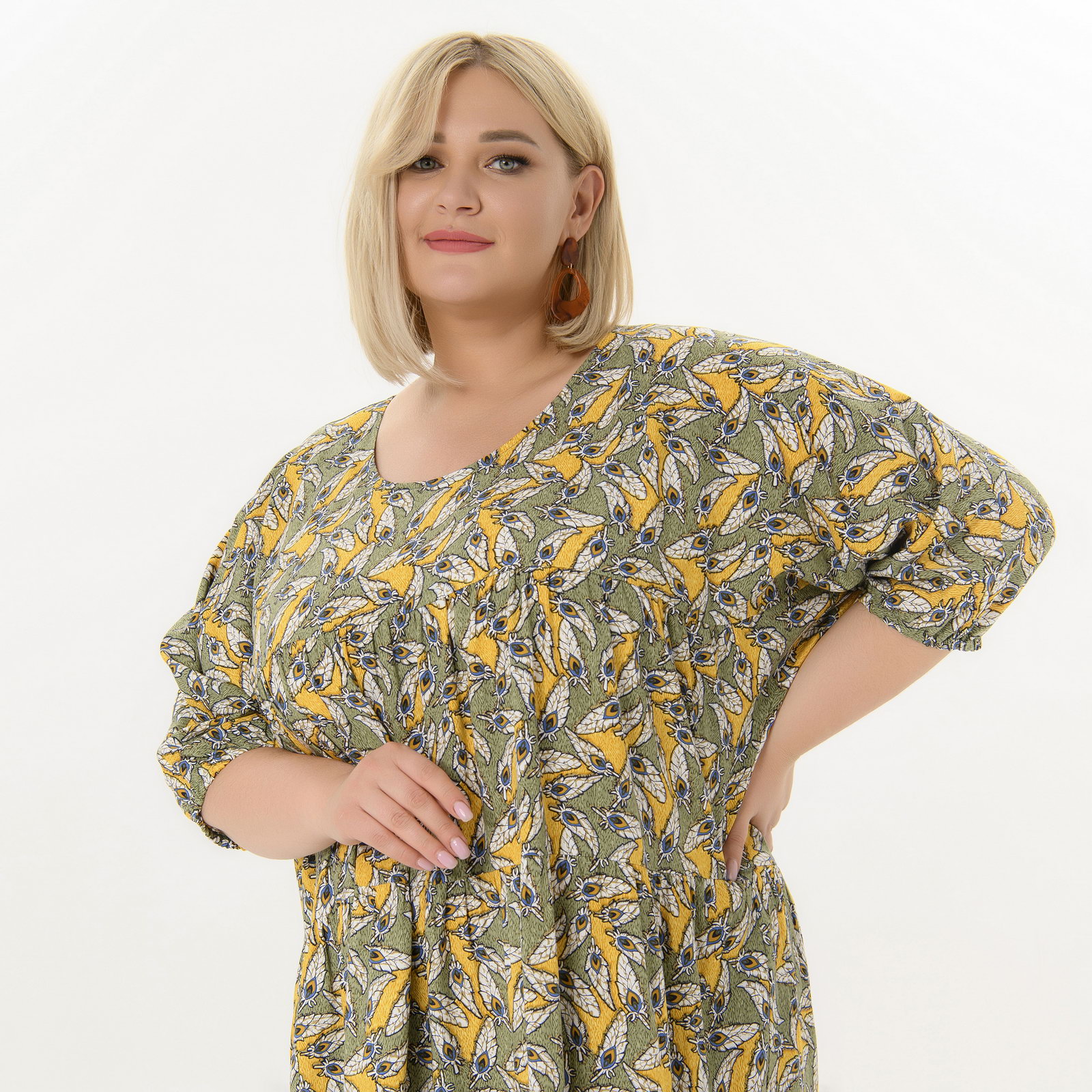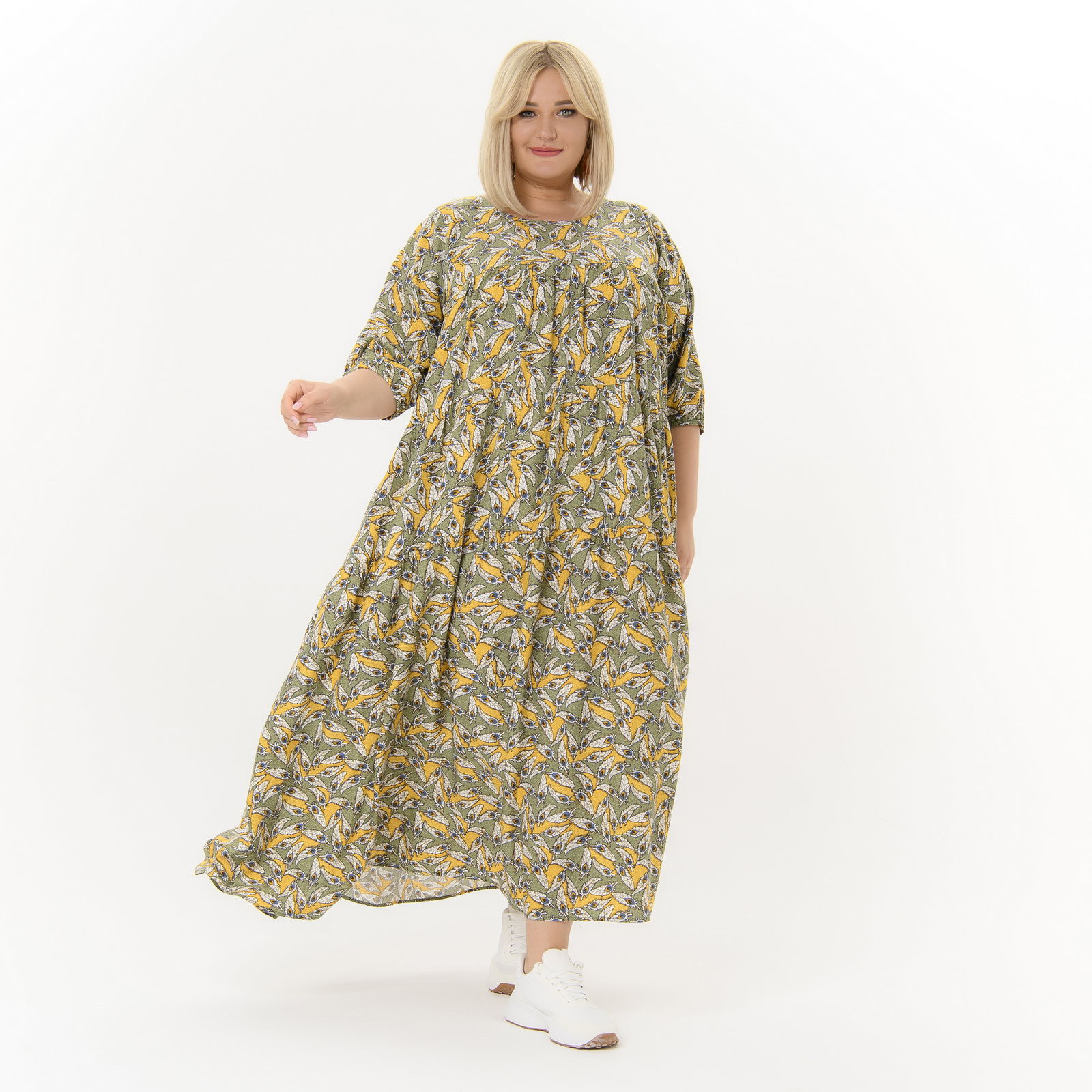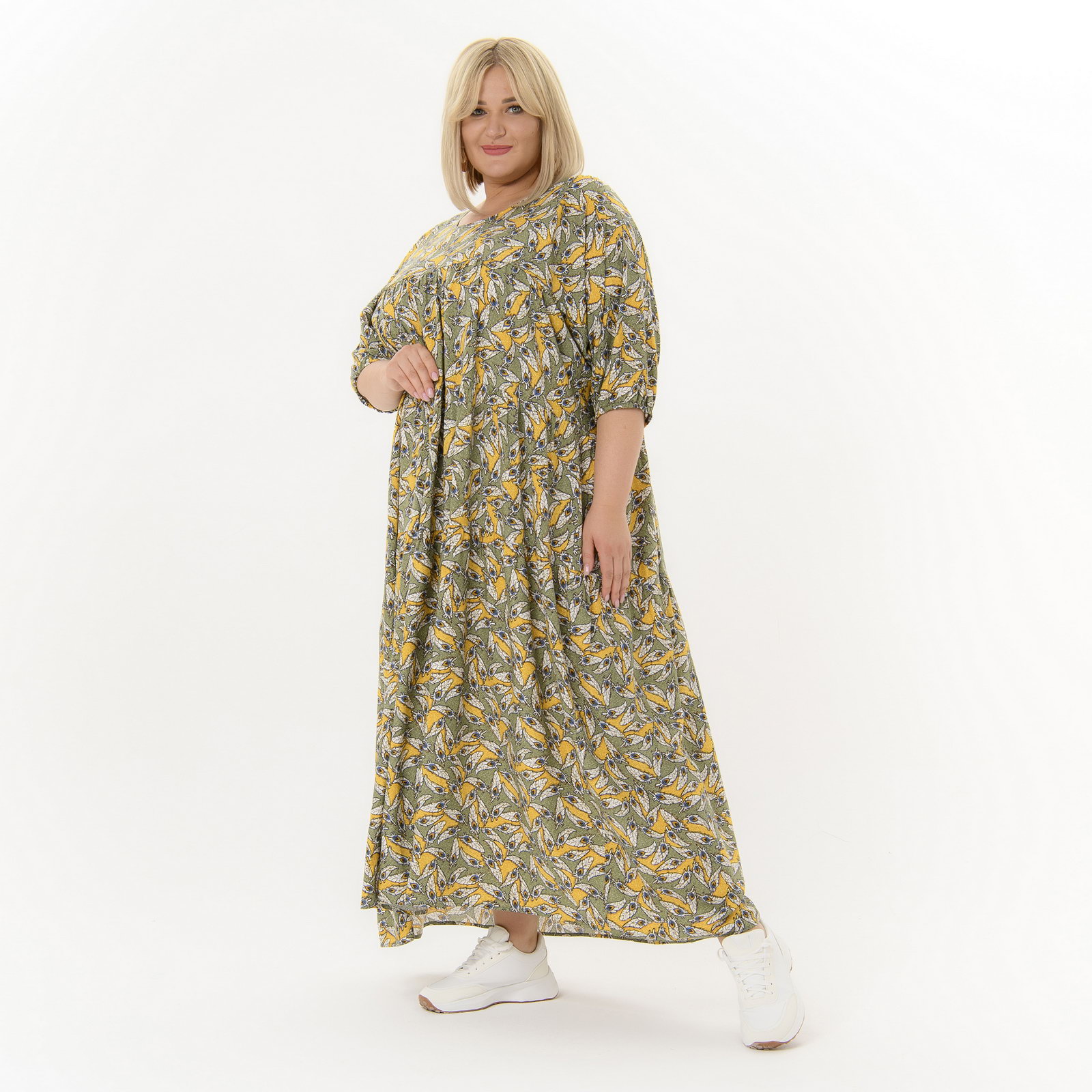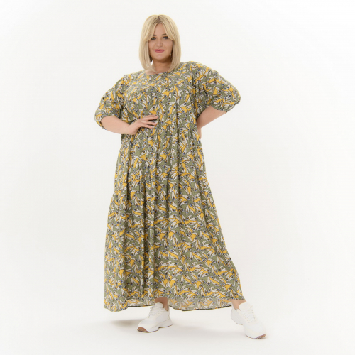 Платье длинное из штапеля свободного силуэта. Отрезное по линии груди, нижняя часть платья присборена. Рукав закрывает локоть, низ рукава на резинке. Вырез горловины округлый.
