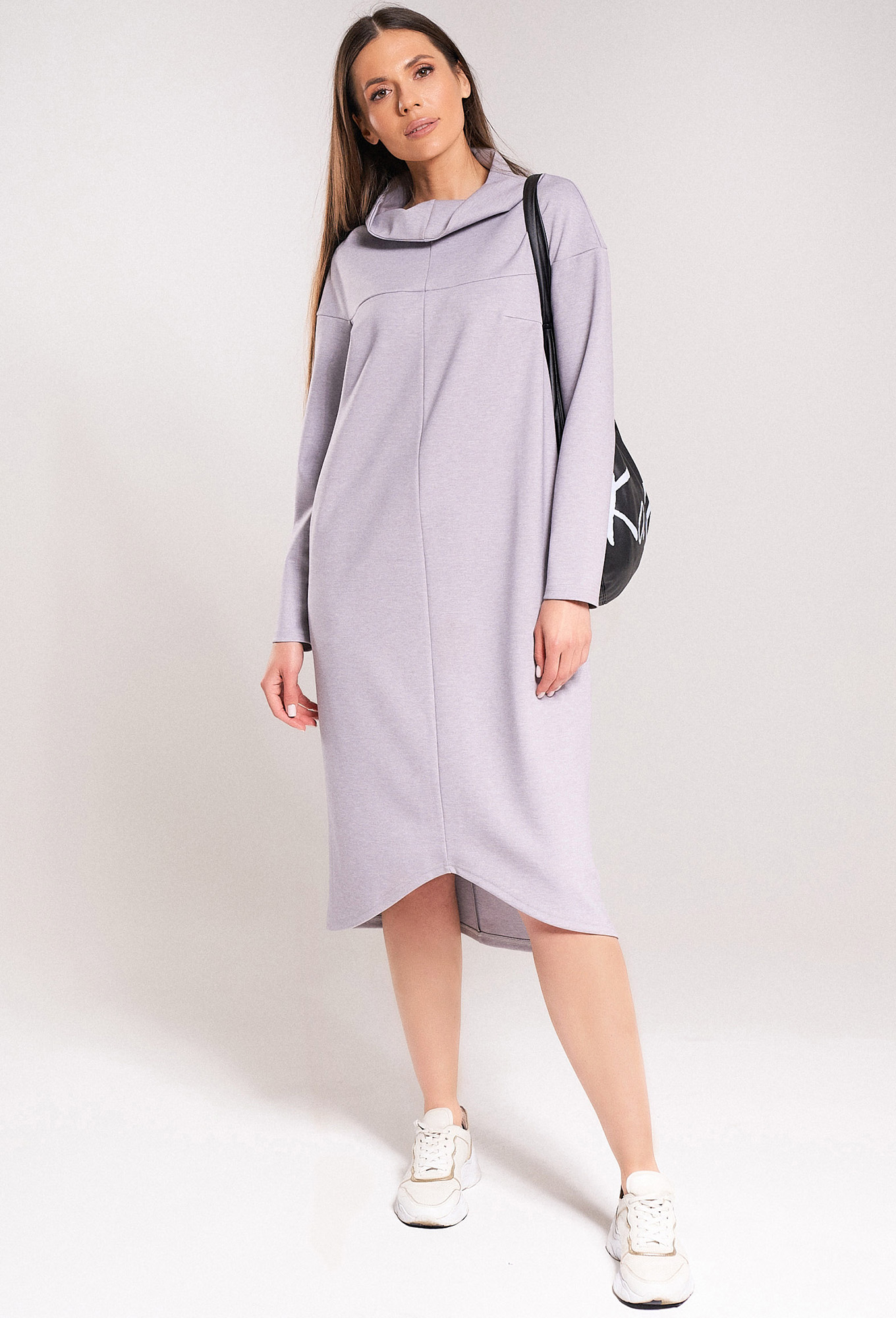 Платье женское свободного силуэта выполнено из трикотажного полотна. Рукав втачной. Воротник стойка цельнокроеная. Платье с карманами в швах и фигурным низом по переду.