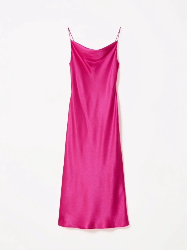 Платье-комбинация цвета фуксии. Выполнено из струящегося материала с содержанием вискозы. Платье на тонких бретелях эффектно открывает спину. Акцент на зоне декольте создаёт вырез-качелька. Модель приталенного силуэта в длине миди выгодно подчеркнёт фигуру. Подойдёт для праздника и творческих мероприятий, а также впишется в повседневные образы в паре с жакетом или кардиганом. Платье можно стилизовать с объёмным кардиганом и обувью на плоском ходу или с однотонным жакетом и босоножками на высоком каблуке