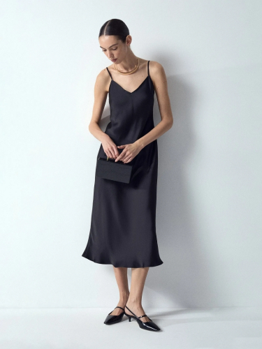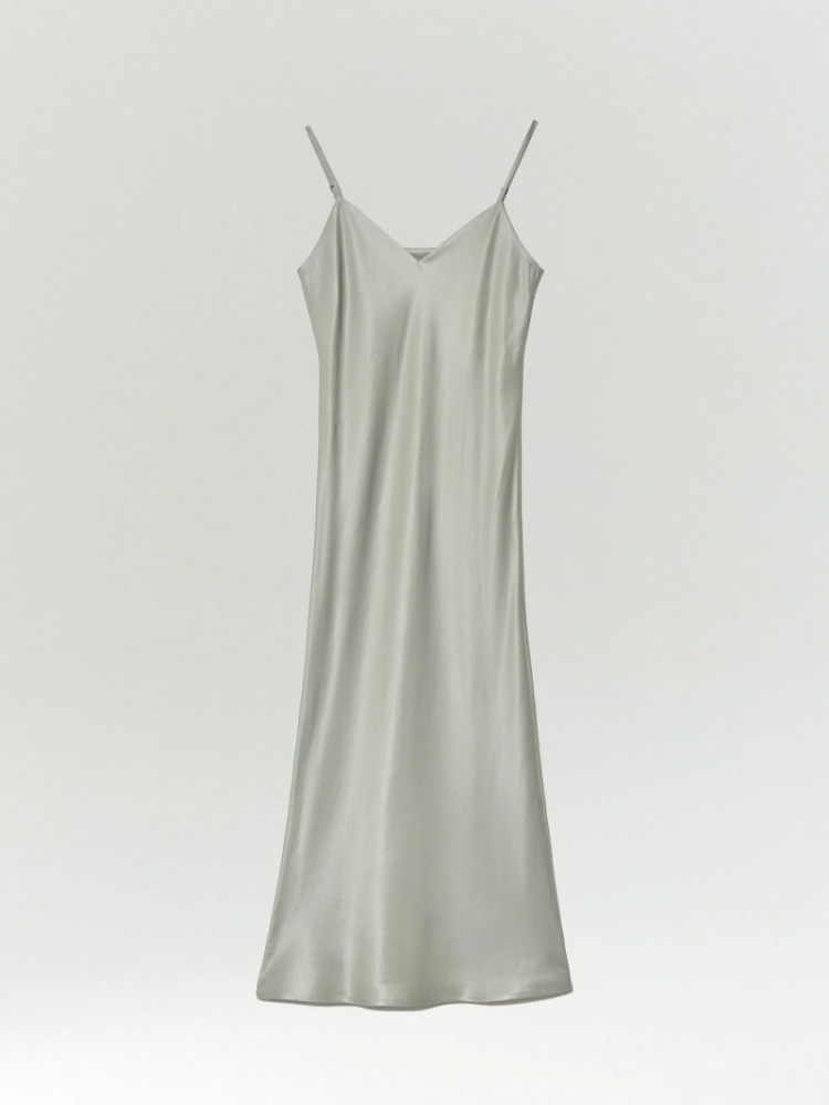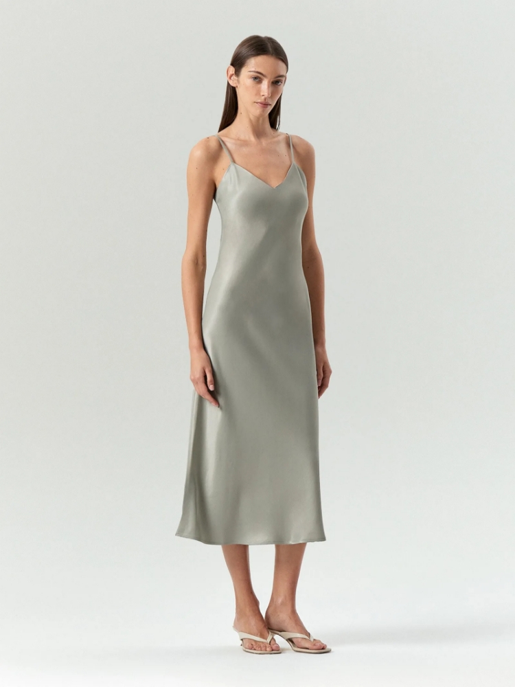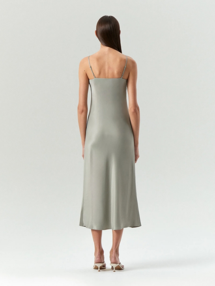 Комбинация в актуальном оттенке между фисташкой и шалфеем. Приталенная модель с деликатным треугольным вырезом подчеркнет красоту зоны декольте, шеи и плеч. Длина миди располагает к сочетанию с обувью на высоком каблуке. Платье подходит для создания роскошных праздничных образов. В повседневных образах будет выигрышно смотреться с разнообразными жакетами и куртками, в том числе из кожи и экокожи. Выполнено из струящейся вискозы, без подкладки