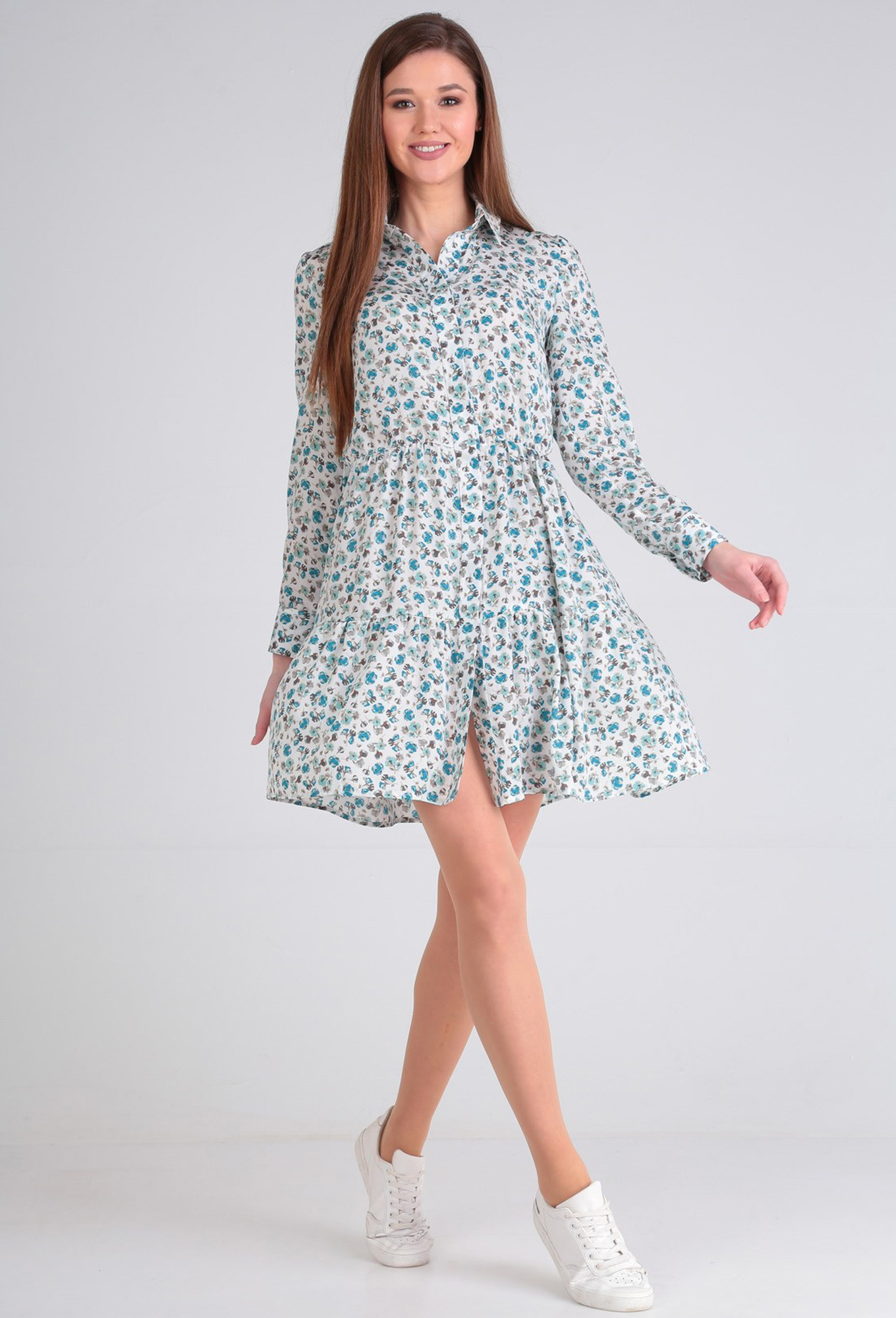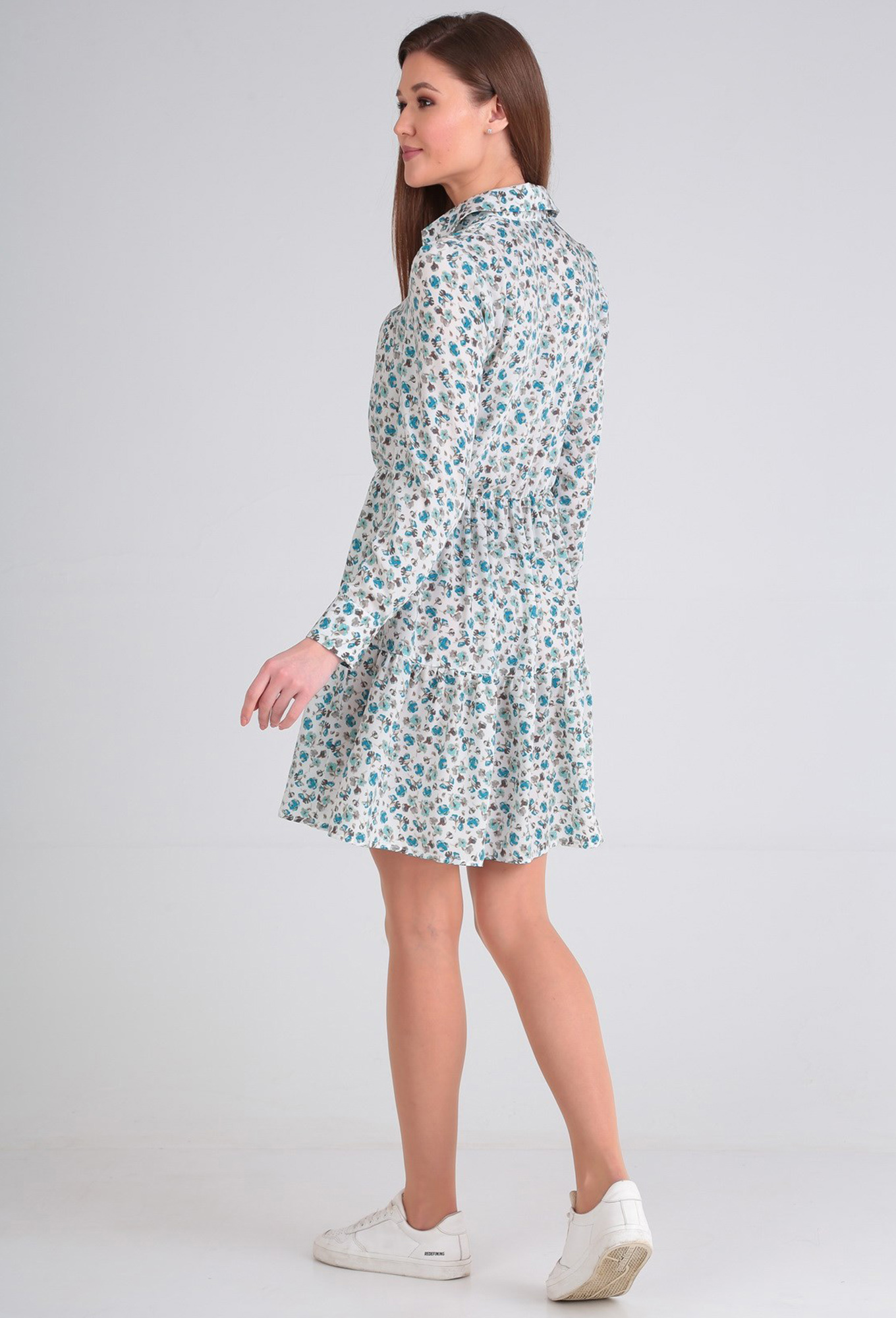 Платье свободного силуэта отрезное по линии талии. Лиф состоит из передней части с нагрудными вытачками. Спинка без вытачек. К лифу пришиты два волана. По переду пришита планка с потайной застёжкой на 7 пуговиц и петель. Воротник на стойке. Рукав втачной одношовный. По низу рукава пришит манжет с застёжкой на две петли и пуговицы. Длина рукава 62см