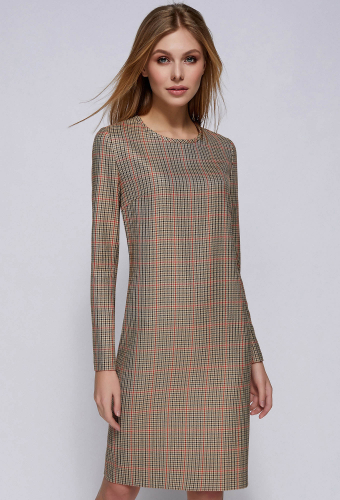 Платье полуприлегающего силуэта. Вырез горловины квадратный. По переду цельнокроеные рельефы, плавно-переходящие в талиевую вытачку. По спинке застёжка по центру на потайную молнию. По низу платья по спинке открытая шлица(разрез). Рукав корткий.