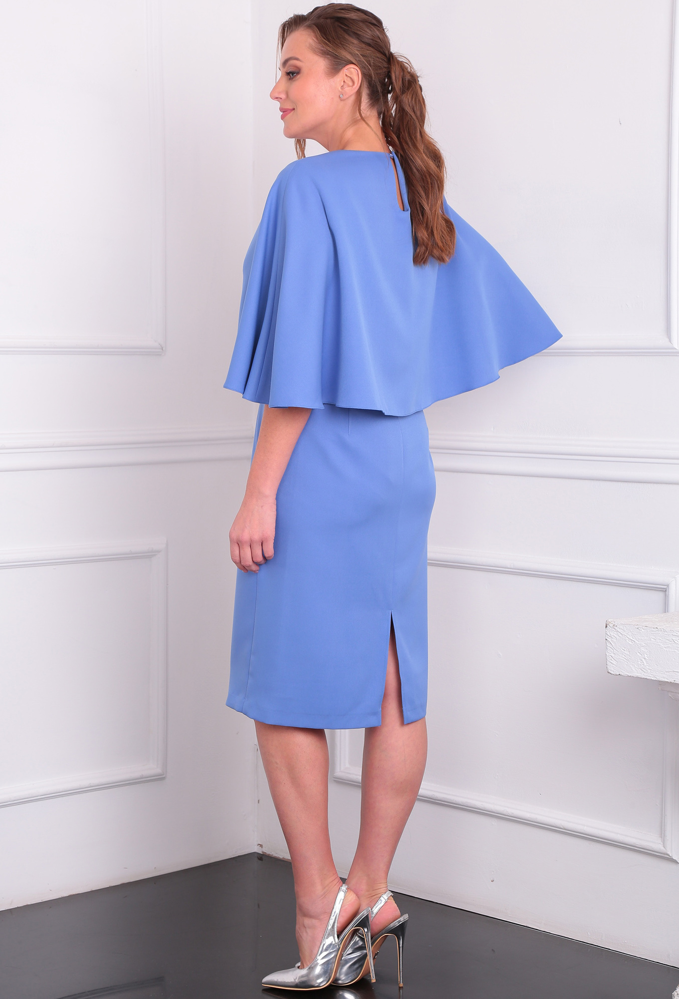 Элегантное и нарядное платье с цельнокроенной накидкой. Платье полуприлегающего силуэта. По линии талии отрезное. По переду юбки застрочены две вытачки. Под накидкой рельефы. Спинка состоит из нижней части юбки с талиевыми вытачками и верхней части. Накидка по спинке полностью отлетная. Вырез горловины V-ОБРАЗНЫЙ. По вырезу горловины притачаны три поперечные планки. По спинке по горловине застёжка на петлю навесную и пуговицу. По линии талии застёжка на потайную тесьму-молнию в левом боковом шве. Накидка хорошо скрывает несовершенства фигуры, если таковые есть, при этом не сковывает движения рук, а придаёт лёгкость и элегантность. По спинке по низу открытая отлетная шлица (разрез).