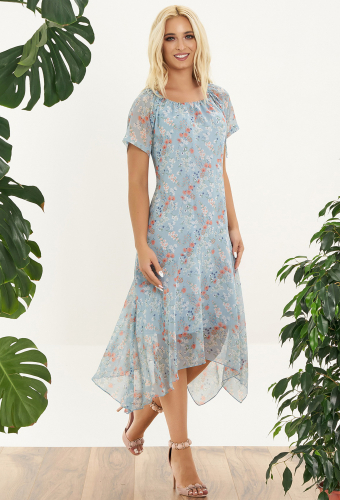 Платье женское полуприлегающего силуэта, расширенное к низу, без подкладки. По переду от линии бедра вертикальный подрез, от подреза к боковому шву идут воланы  со сборкой. Рукав короткий, цельнокроеный с притачной манжетой. Вырез горловины лодочкой, обработан обтачкой. Платье свободного кроя. Для более облегающей посадки по фигуре, можете выбрать меньший размер.