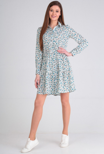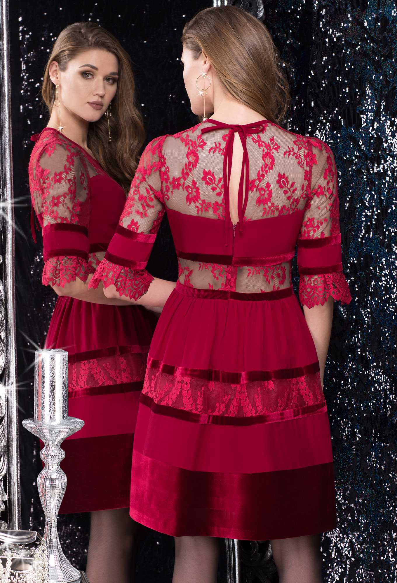 Платье приталенного силуэта с расклешенной юбкой, отрезное по линии талии. Состоит из трех основных видов ткани: креп-шифон, велюр и кружево. Лиф выполнен из креп-шифона, с фигурной линией втачивания кокетки из кружева. Верхняя часть спинки из креп-шифона и кружева. Рукав втачной укороченный одношовный, верхняя часть из кружева, нижняя из чередующихся подрезов из велюра, креп-шифона и манжетой со складками из кружева с фестонами. По линии талии переда и спинки вставка из кружева и велюра. Нижняя часть платья выполнена из чередующихся подрезов из велюра, креп-шифона и кружева. Юбка на подкладке и фатине, который придает пышность. Застежка на потайную тесьму-молнию в среднем шве спинке. Вырез горловины круглый с окантовкой. переходящий в завязку.