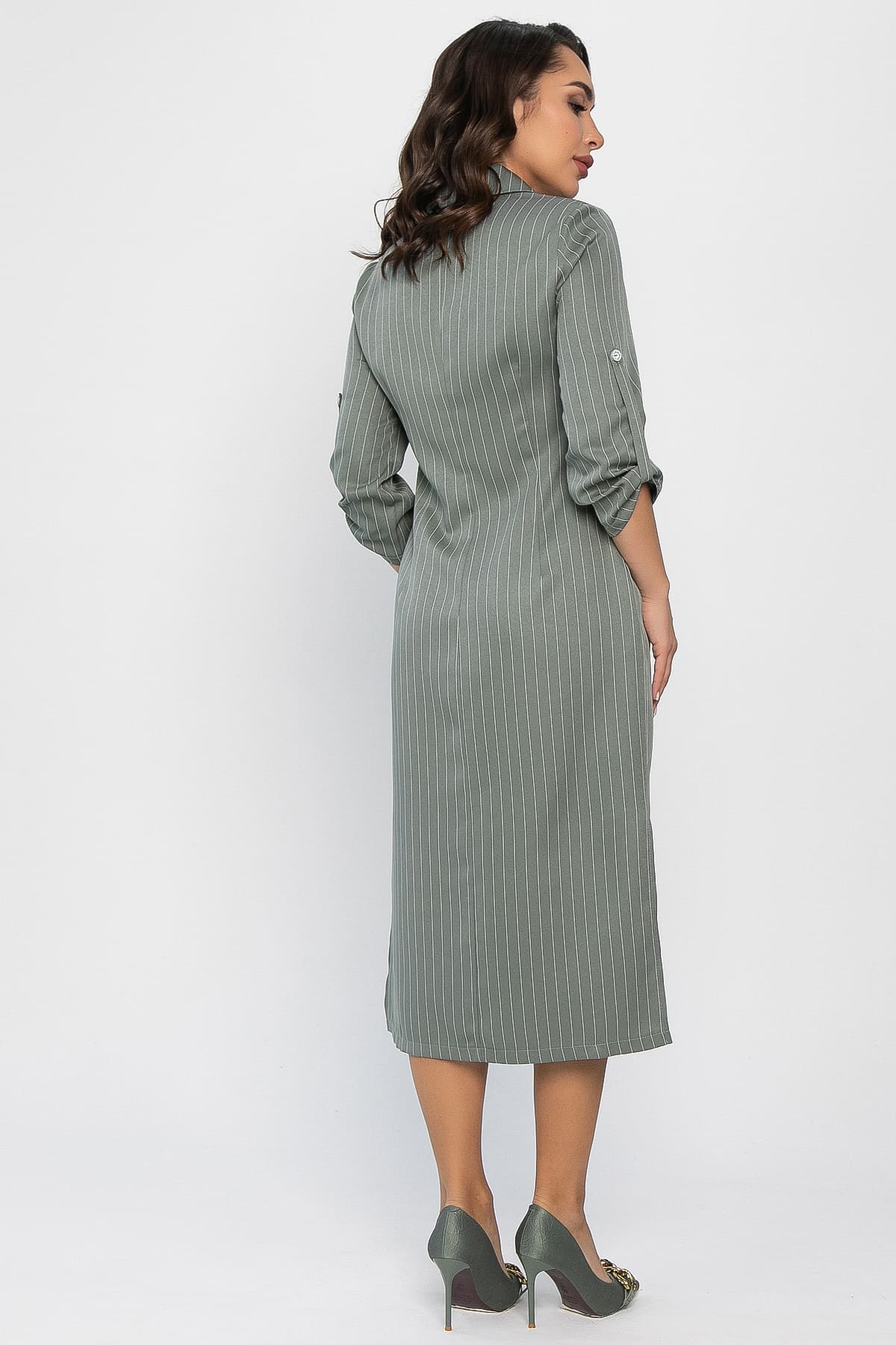 Светло-зеленое платье прямого кроя станет идеальным выбором для повседневных рабочих дней и официальных мероприятий. Удобные боковые разрезы придают образу динамичность и легкость. Рукава длиной три четверти изящно завершаются патой с пуговицей, добавляя изделию утонченности. Отложной воротник создает классический и элегантный вид. Это платье станет отличным выбором для тех, кто ценит комфорт и стиль в деловой обстановке.