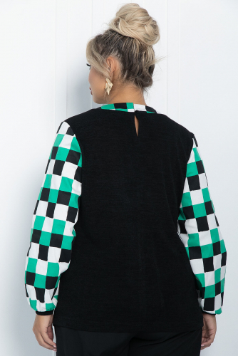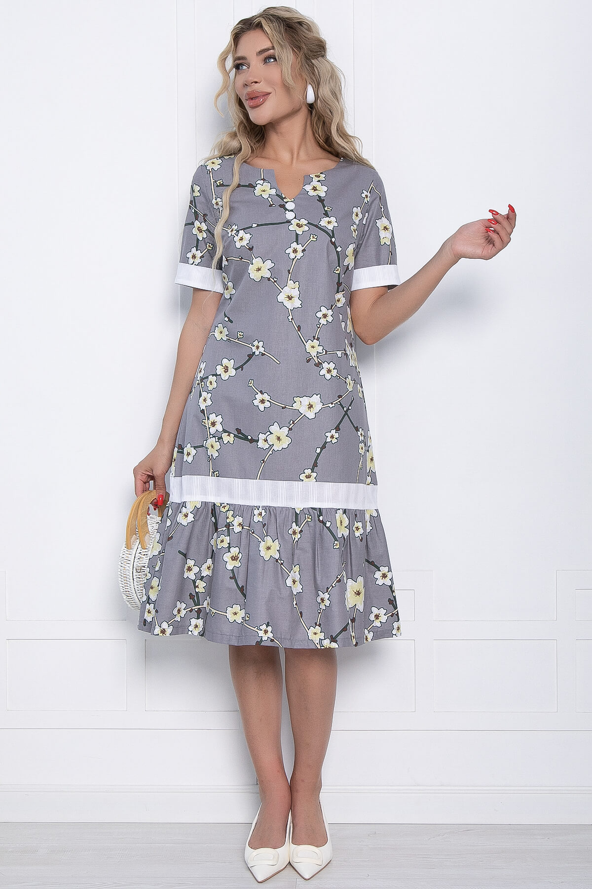 Платье свободного кроя, по низу изделия полоска из отделочной ткани и рюша из основной ткани, горловина обработана рельефной обтачкой, спереди имитация пуговиц, по низу рукавов манжеты из отделочной ткани. Пояс из основной ткани входит в комплект, с помощью которого можно подчеркнуть талию.