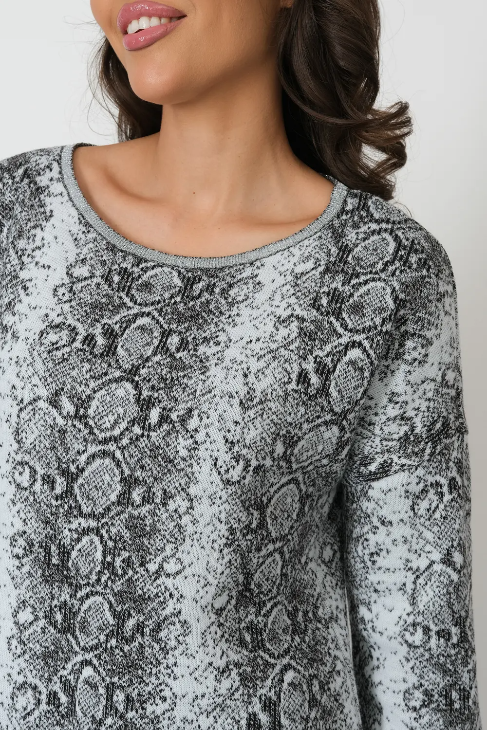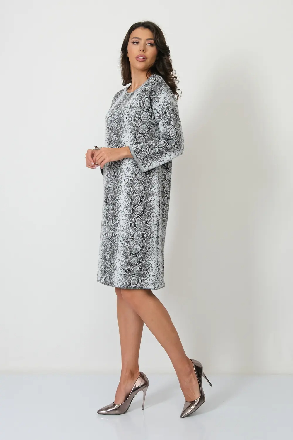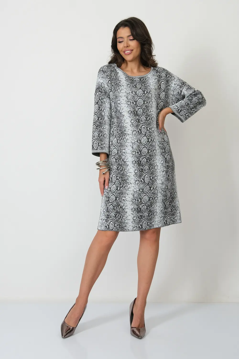 Женское трикотажное платье свободного силуэта. Вырез горловины круглый, рукава втачные длиной 7/8 со спущенным плечом. Платье выполнено жаккардовым переплетением, образущим орнамент, имитирующий змеиный окрас. серый микс