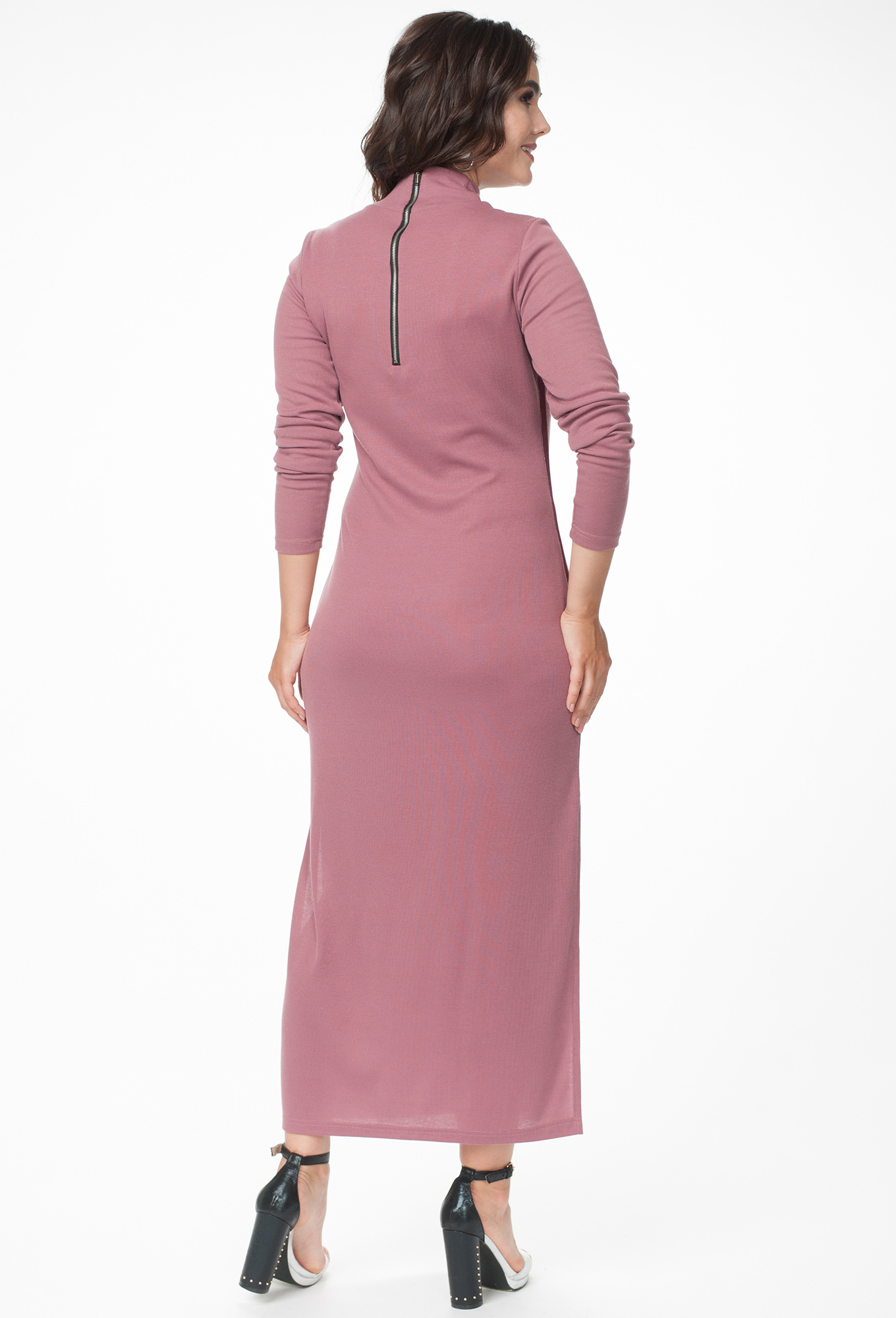 Трикотажное платье(ткань в рубчик),полуприлегающего силуэта. Застёжка на декоративную молнию по спинке, рукав втачной, с настроченной контрасной тесьмой ,так же тесьма настрочена и по боковому шву, имеются два разреза.