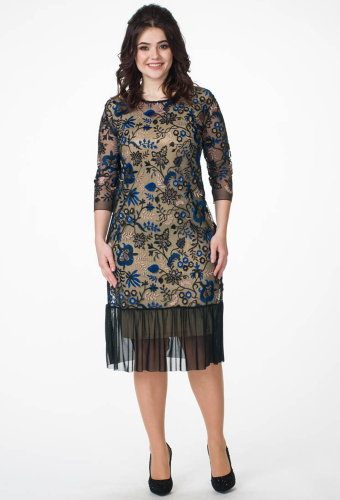 Платье нарядное, состоящее из двух платьев.Платье-чехол выполнено из трикотажного полотна. Верхнее платье выполнено из сетки с декоративной вышивкой. Спинка с центральным швом и потайной молнией, Застежка на пуговицу. Длина рукава в 48р - 42см. Длина изделия по спинке в 48р - 109см.