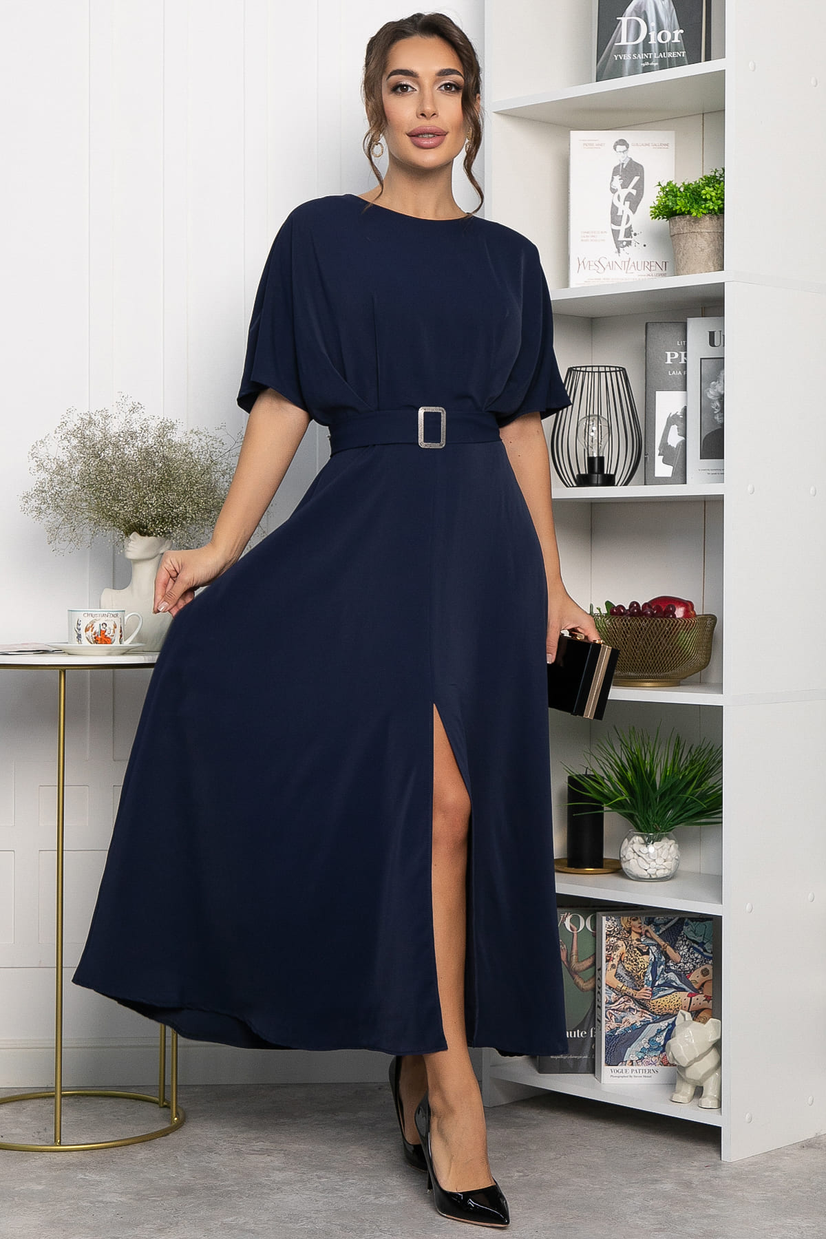 Элегантное платье — настоящая находка для тех, кто ценит красоту линий и безупречный стиль. На спине расположена молния, которая облегчает процесс надевания. Платье имеет отрезную талию и две вертикальные складки, которые выполняют функцию вытачек, создавая изящный силуэт. Юбка длиной макси имеет форму расклешённой трапеции с эффектным разрезом спереди, что придаёт движениям динамичность и лёгкость. Пояс из основной ткани с металлической пряжкой, который входит в комплект, подчёркивает талию и завершает образ, придавая ему утончённости и стиля. Это платье — идеальный выбор для особых случаев и вечерних выходов.