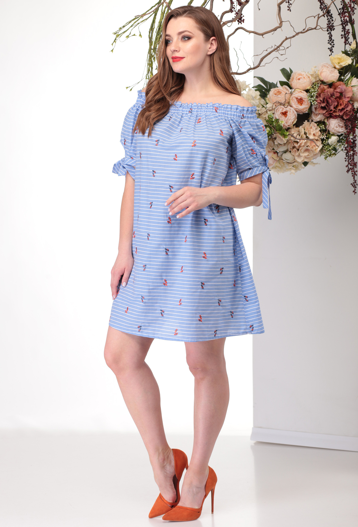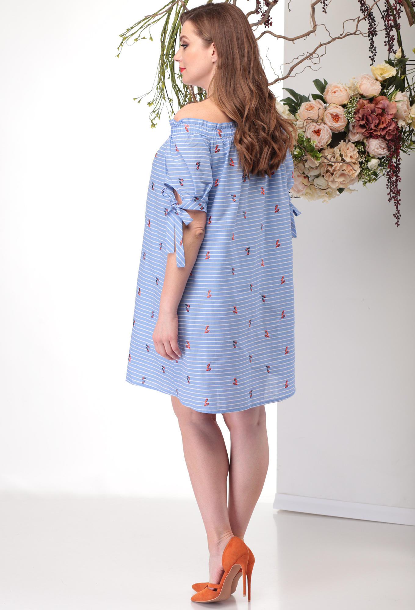 Лёгкое и просторное летнее платье. За счёт украшающей ткань вышивки будет актуально смотреться как на пляже, так и в городском кафе.  Прямое по крою имеет спущенное плечо, которое фиксируется благодаря резинке. Рукава фонарики на завязках. Длина 81+-1 см.