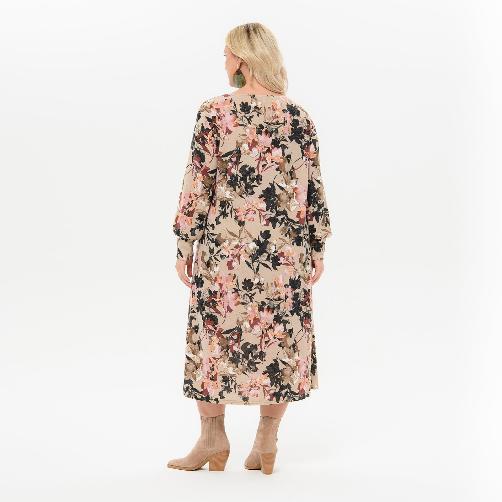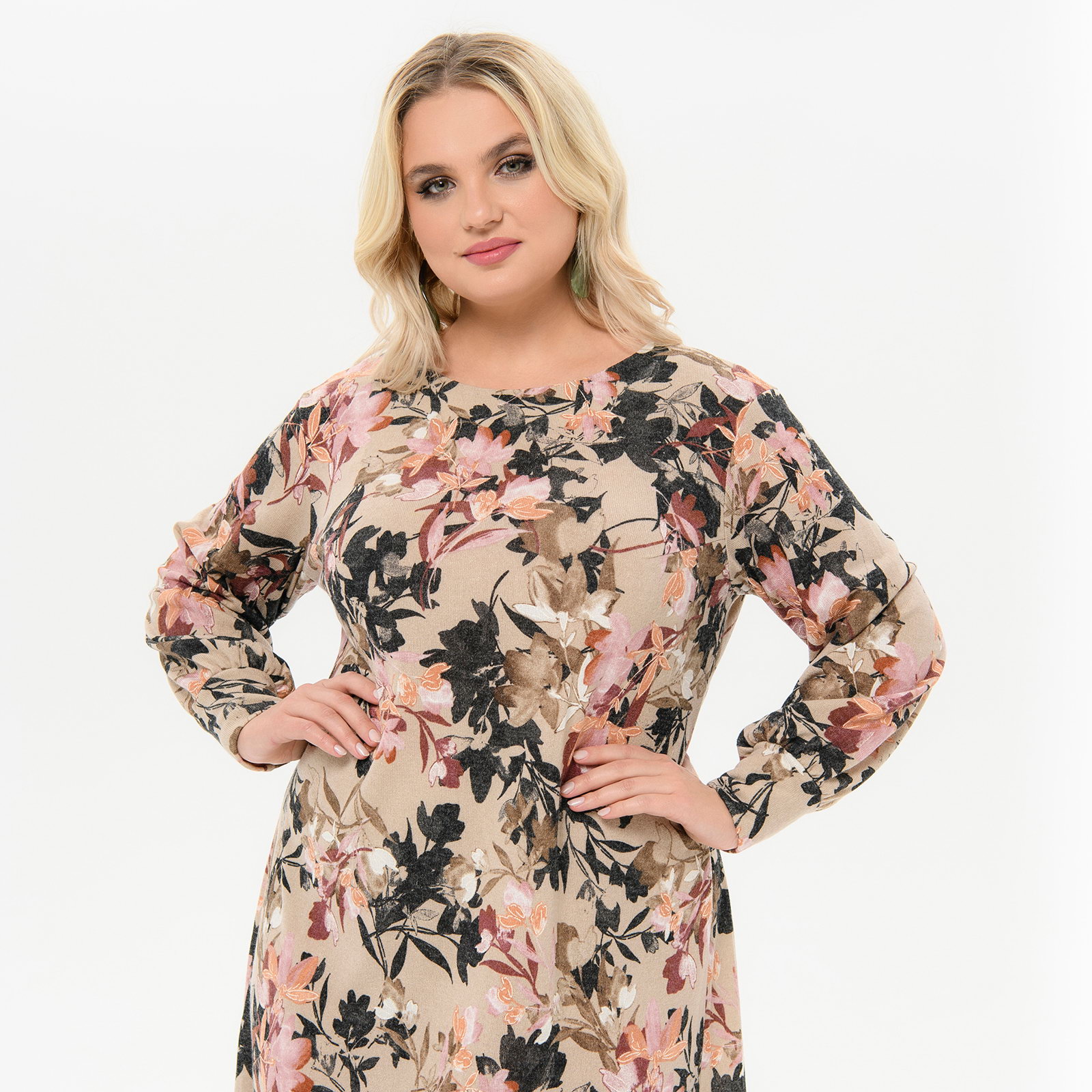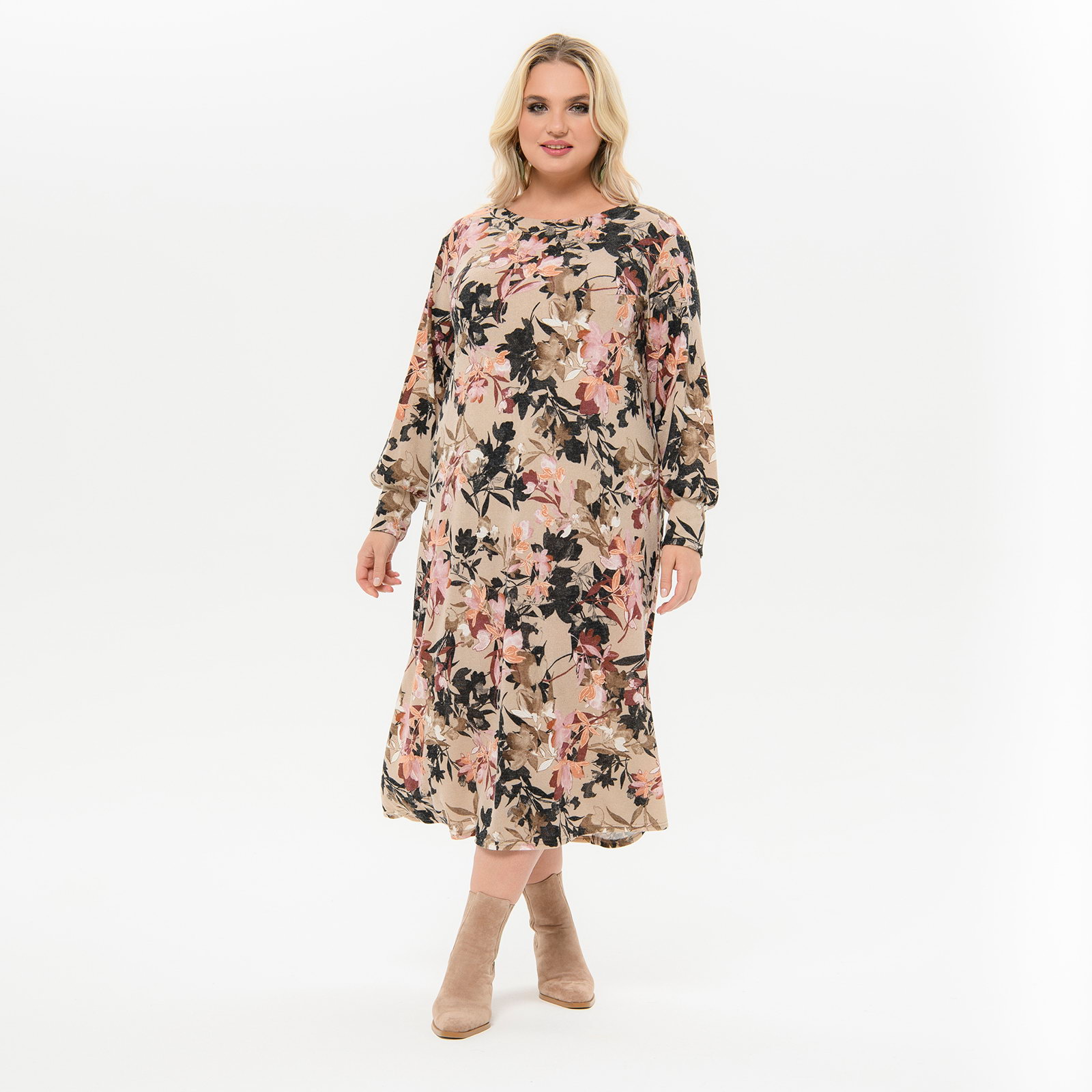 Платье миди А - силуэта, джерси - ангора бежевая, принт цветочный *